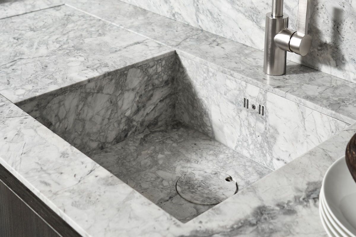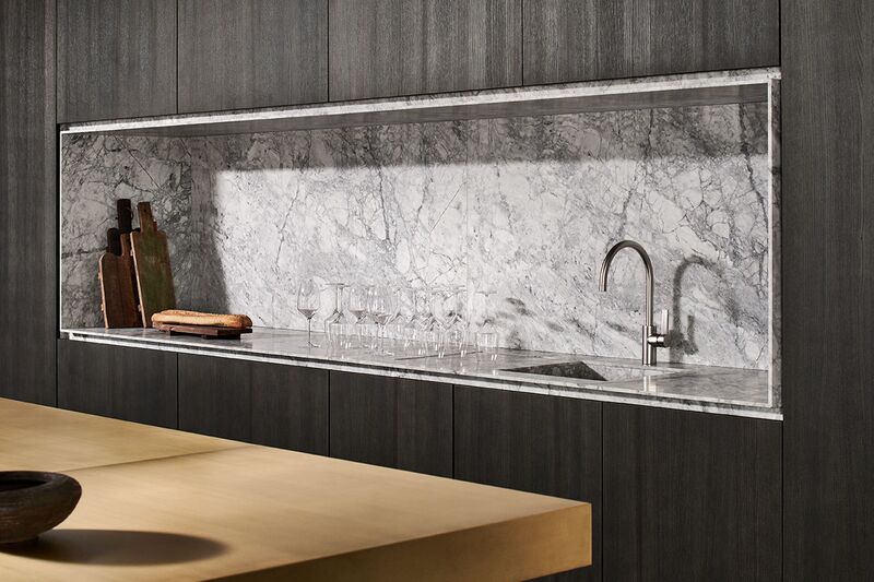 Quarzit Bianco Nuvola – Messing geschliffen – Kernesche anthrazit Furnier