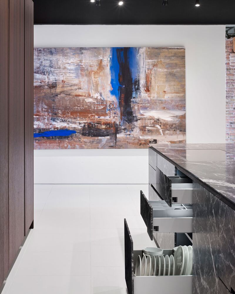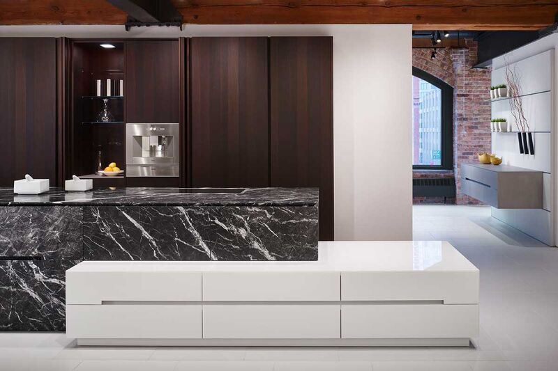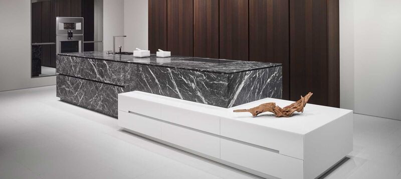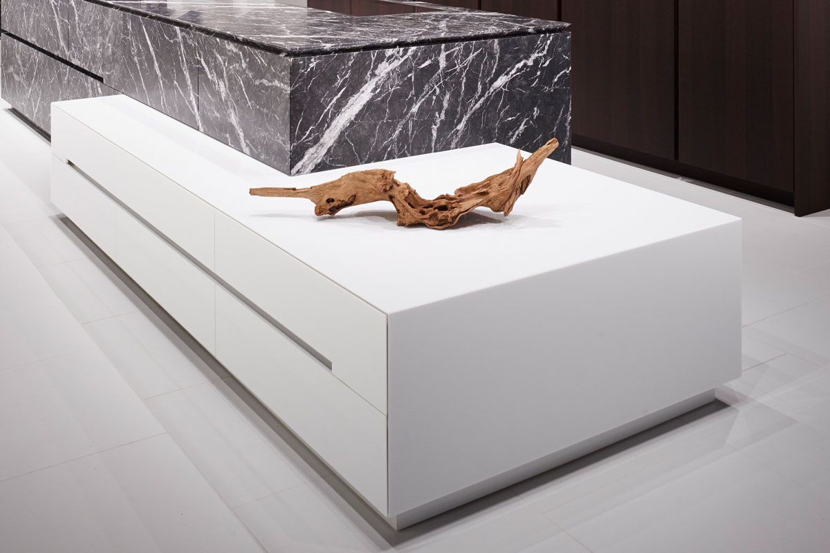 Insel in Kalkstein Grigio Carnico und Corian weiss – Hochschränke Furnier Raucheiche