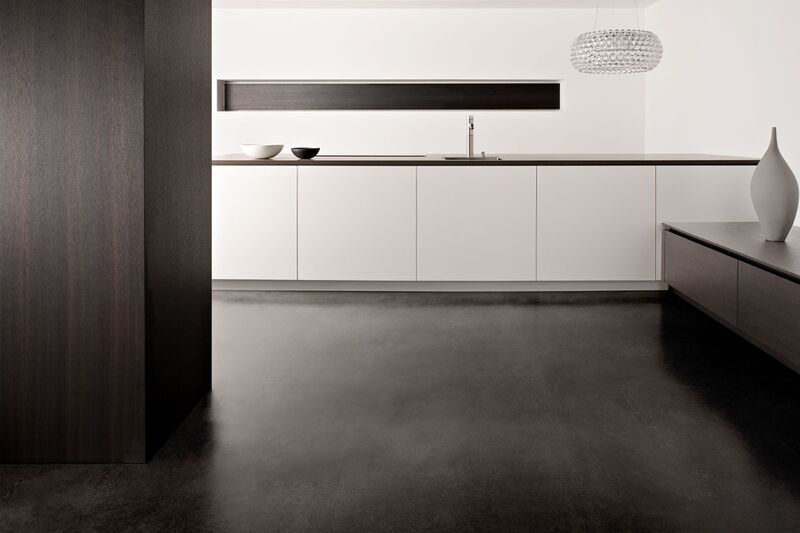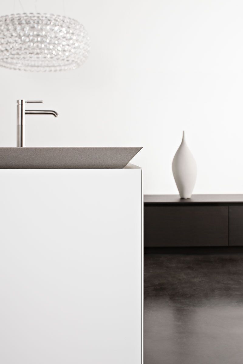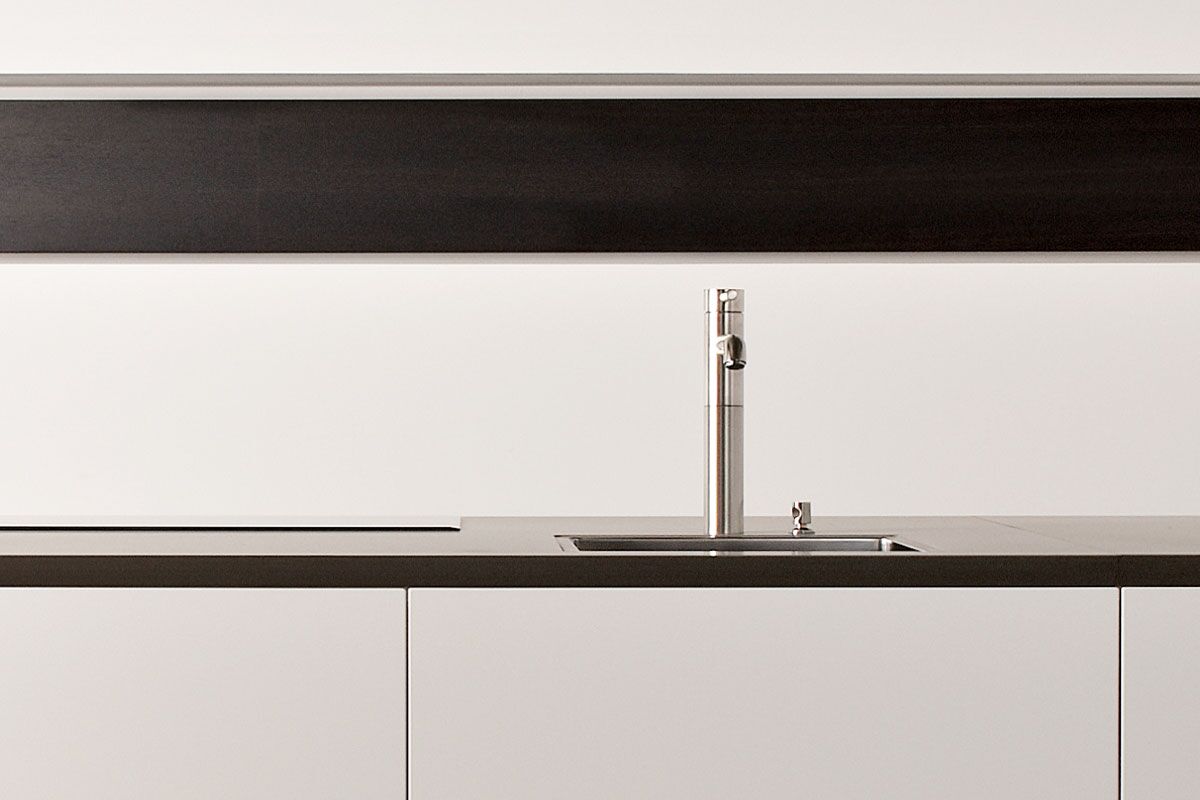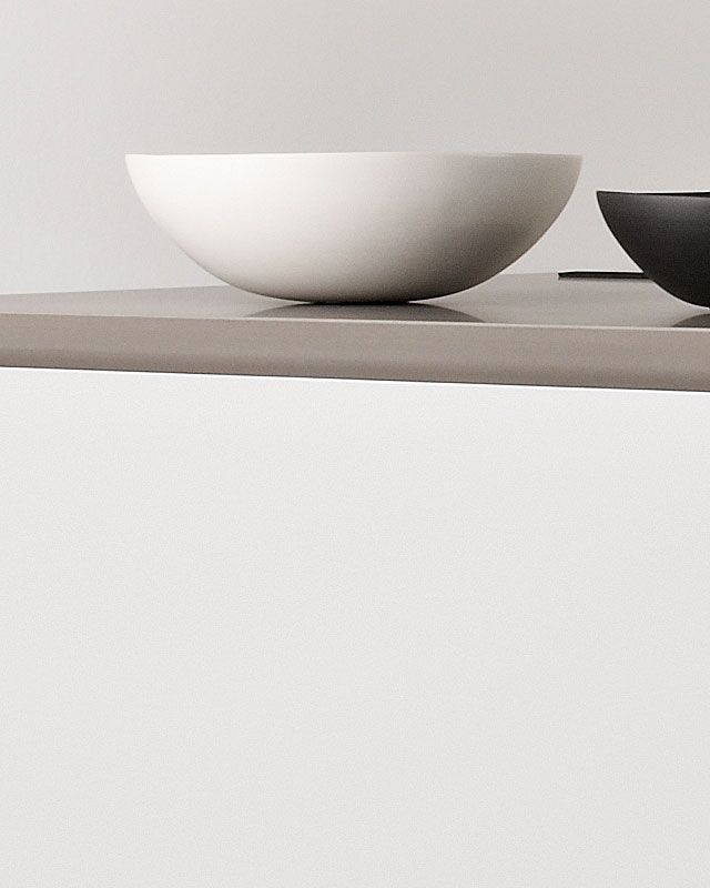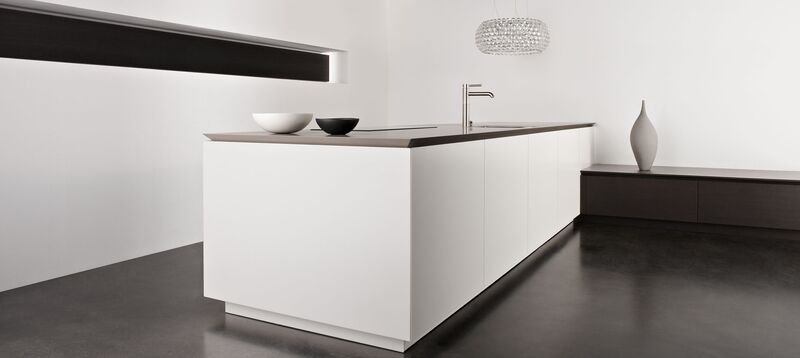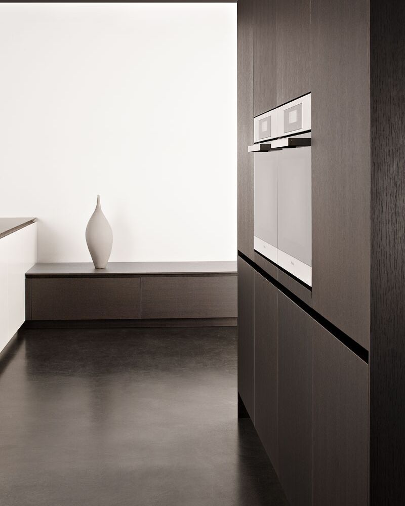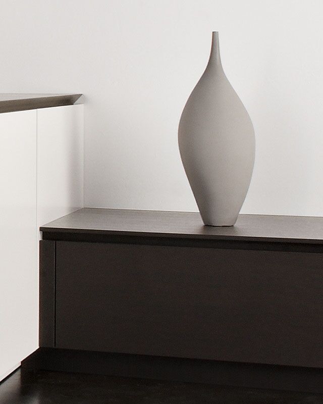 Inselblock Mattlack weiß mit Gehrungsfugen – Hochschränke und Lowboards Raucheiche – Arbeitsplatte Quarzit Silver Moon
