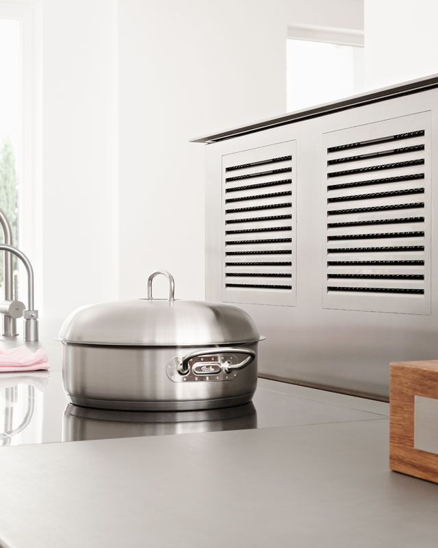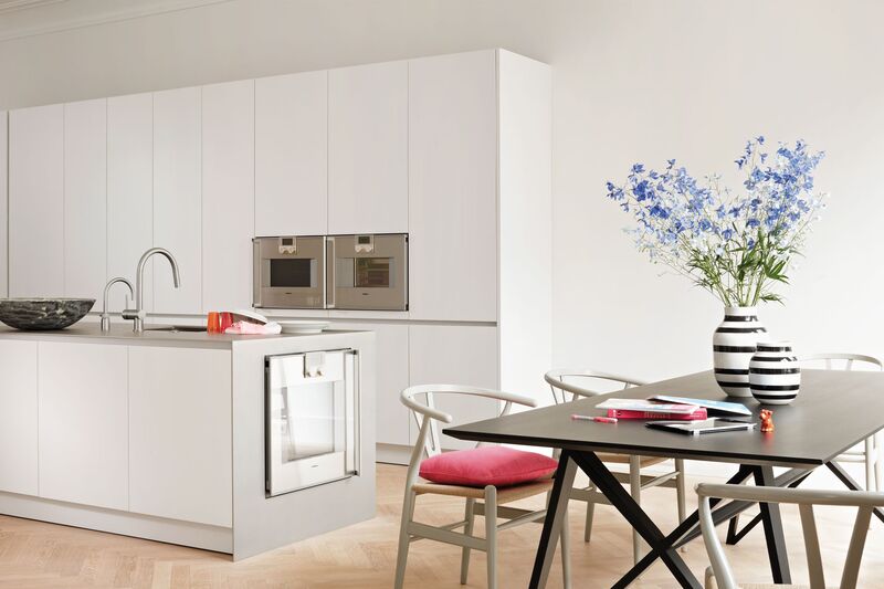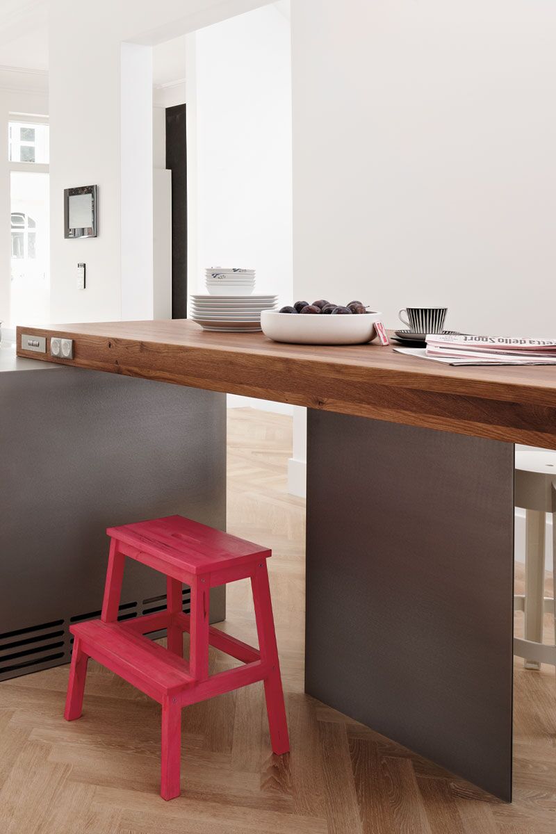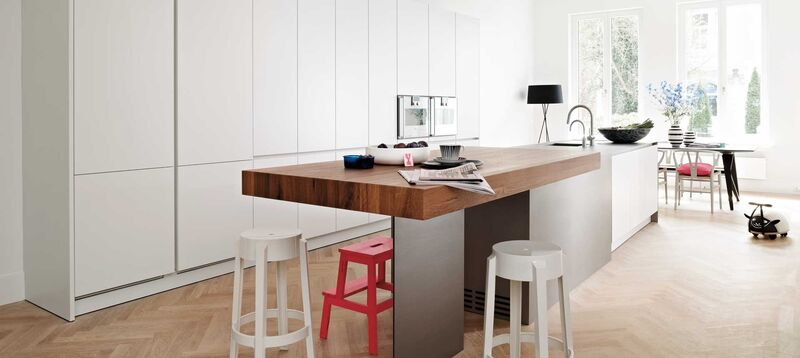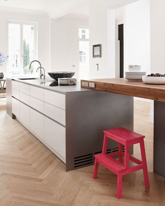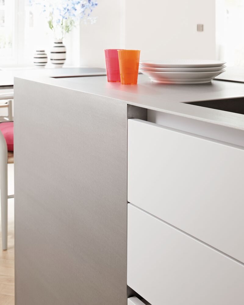 The whole room is flooded with light into which the white kitchen with its surfaces made of Laminate Nano white and a countertop made of stainless steel silverTouch coherently integrate themselves in style and atmosphere. But the highlight and real eye-catcher is the tabletop as a solid block. It accentuates the overall design.