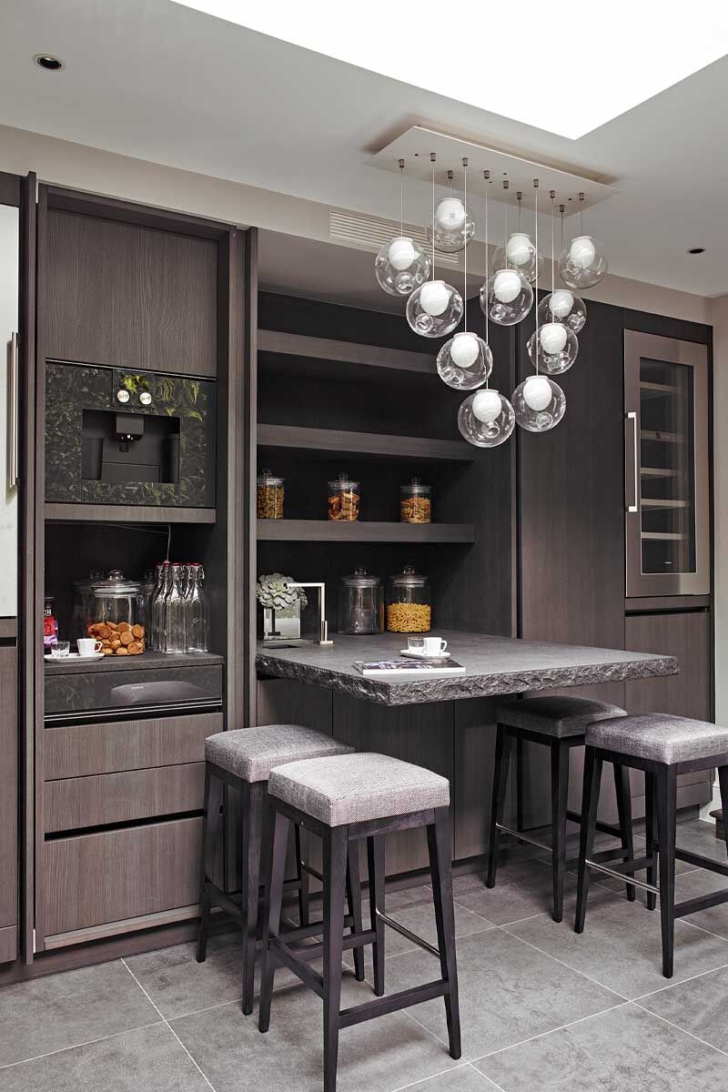 The sculpted stone is especially effective on the tabletop’s sides. A coffee machine and a wine refrigerator are integrated into the kitchen units.