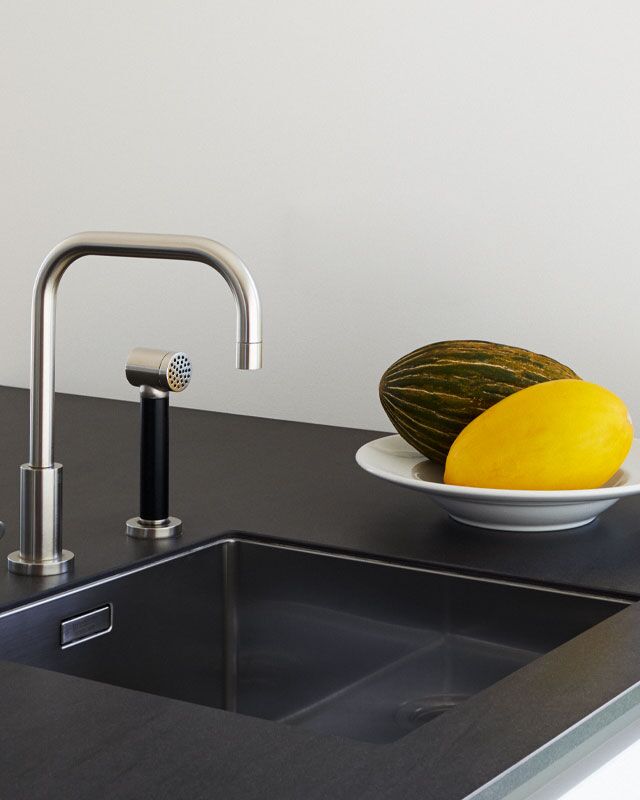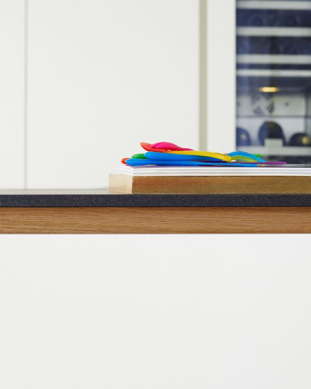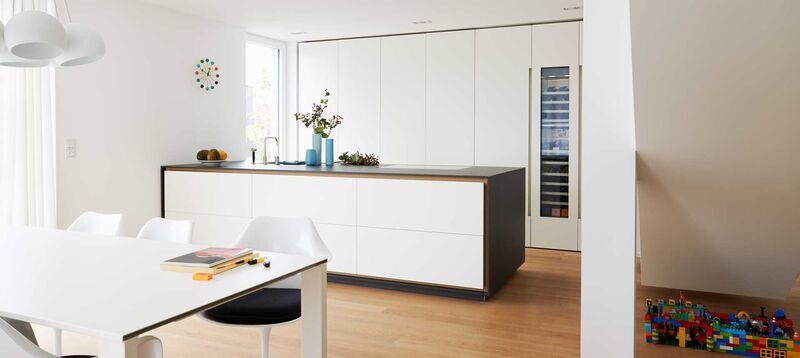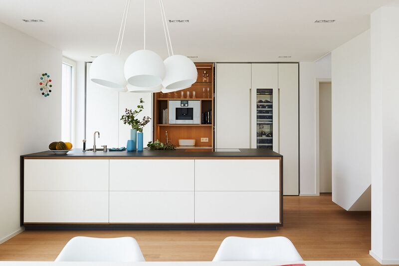 In this family home kitchen, a harmonious overall impression is created by material, shape and environment. The kitchen furniture in modern matt white lacquer contrasts with the classic stone. countertop, while refined details take up further aspects of the interior design.