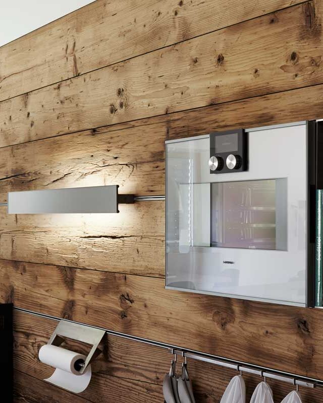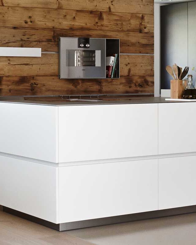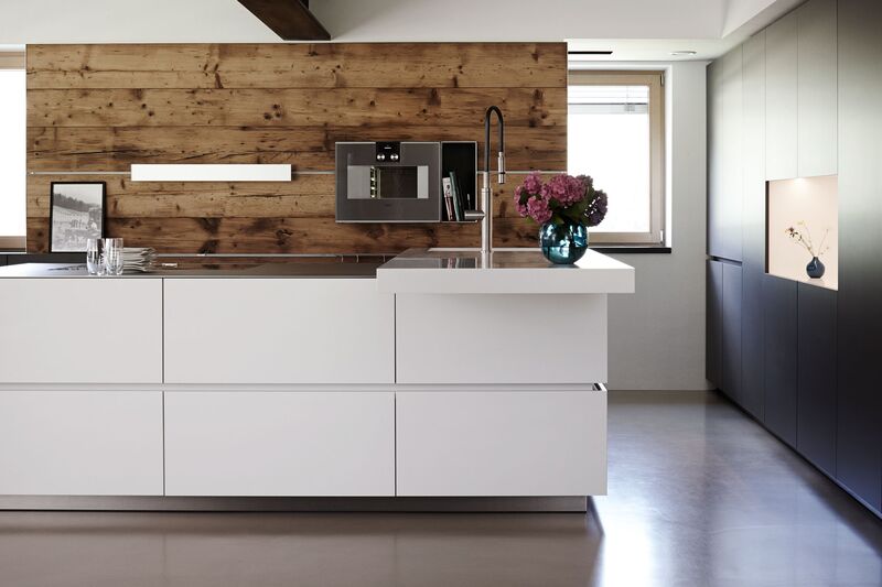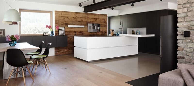 Attractive contrasts: In this Innsbruck villa, a minimalist, technically functional kitchen design with surfaces in white/dark grey Laminate and a silverTouch stainless steel countertop meets an environment that radiates alpine cosiness.