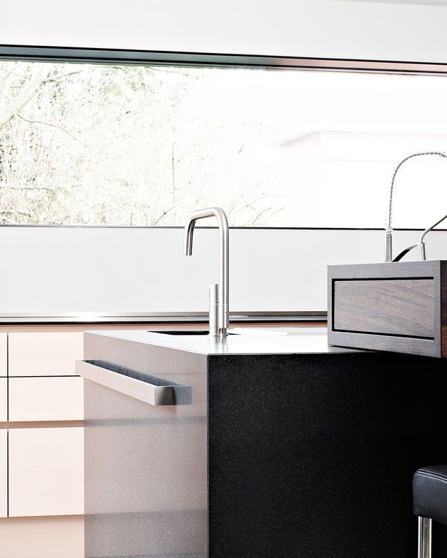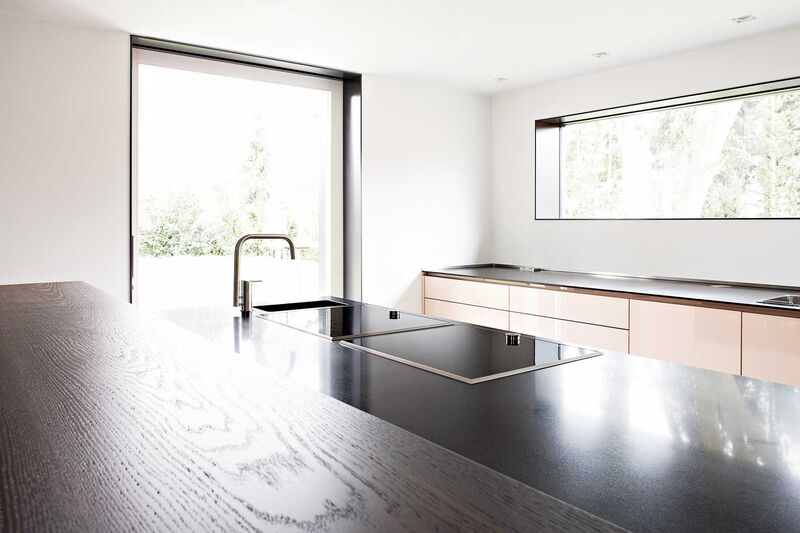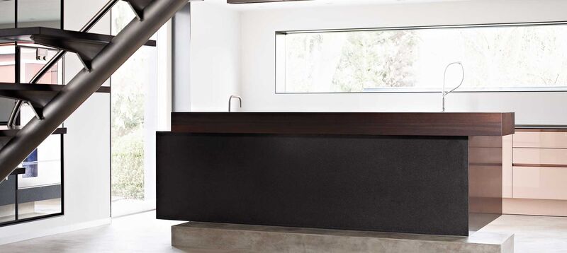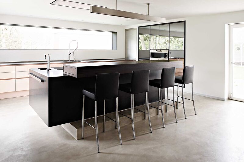 What first draws your eye in this kitchen is also reflected in the tall units with the mirror effect: The island cube, which consists of three horizontal modules of wood, granite and concrete, which are all simply eye-catching. So, this kitchen in a house in Regensburg is impressive in two respects.