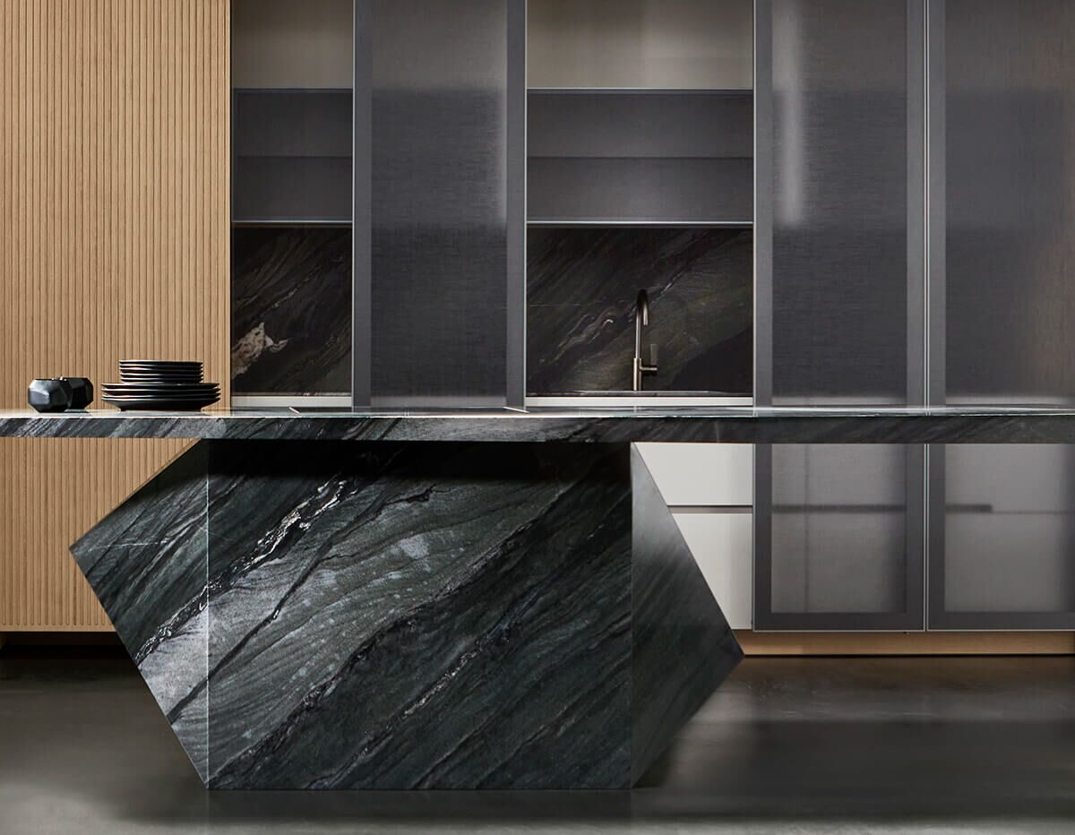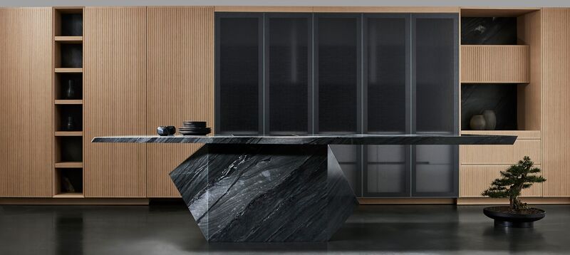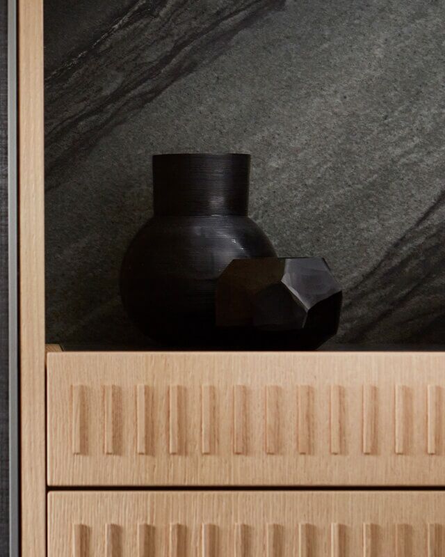 The Black Tempest quartzite, with its flowing veins and shimmering texture, provides a vibrant contrast to OSAKA. The elegant oak veneer accentuates the vertical lines with intricate stripes applied to the fronts precise to measure, creating a very minimalist design.
