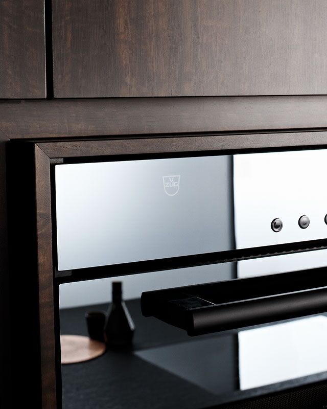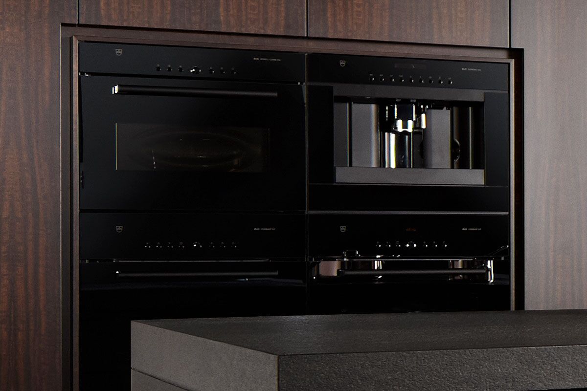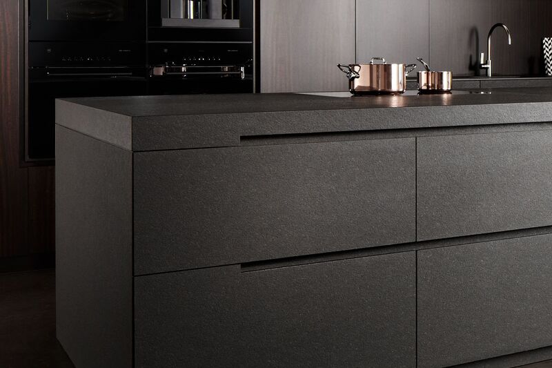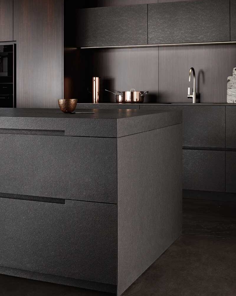 Island block and base units in Granite Nero Assoluto waterjet – Tall units und wall units Eukalyptus Noble Veneer.