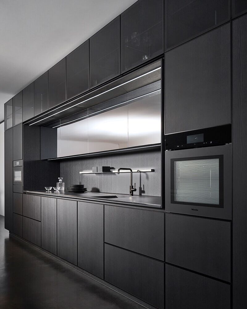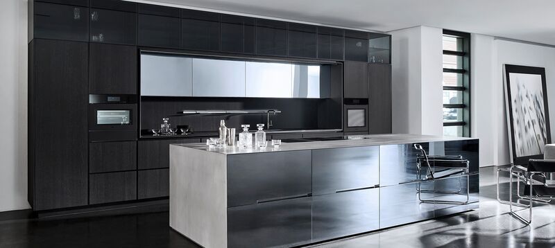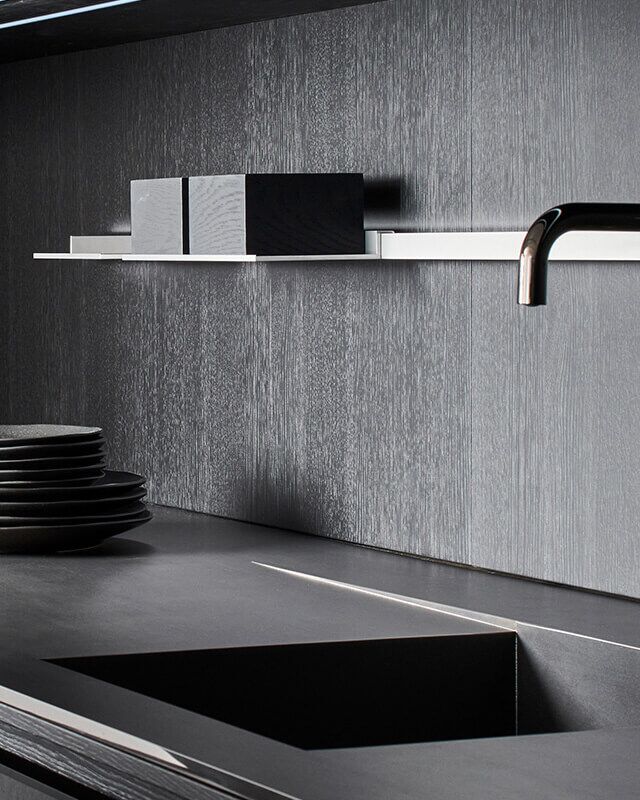 The concept of this minimalist kitchen is based on the monochrome choice of materials and perfectly crafted details – variations of stainless steel surfaces are showcased here with elegant oak veneer in basalt black and matching black glance glass cabinets. The sink area is characterised by stainless steel black-touch with a continuous worktop. The innovative surface has a warm feel and is robust, hard-wearing and easy to clean.