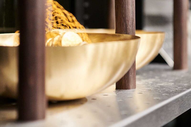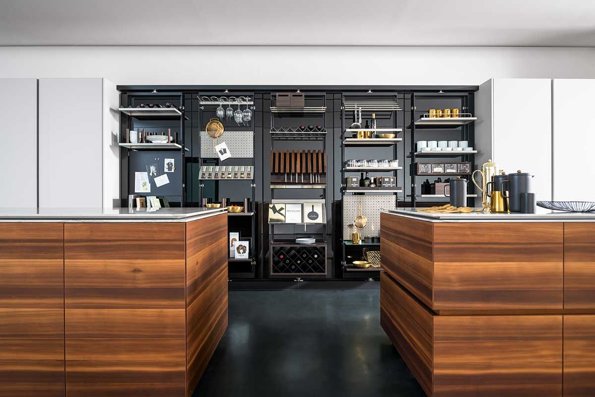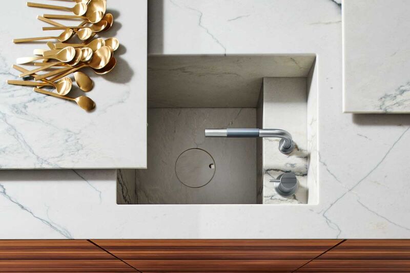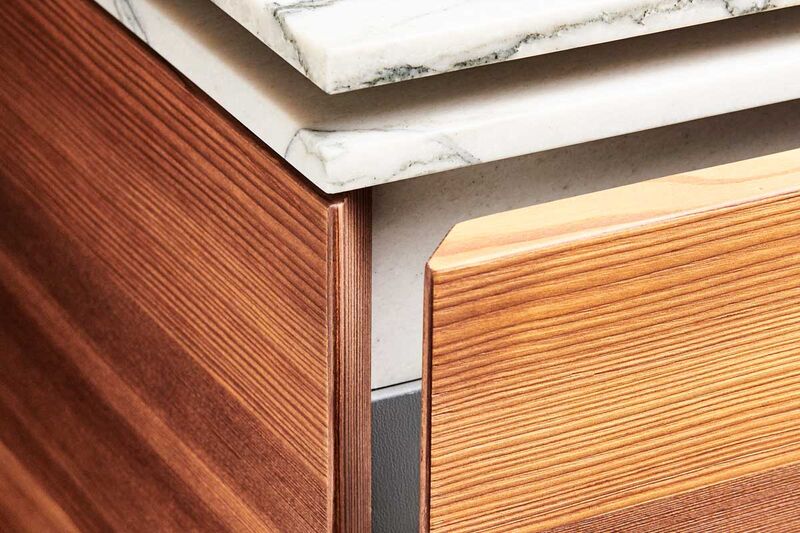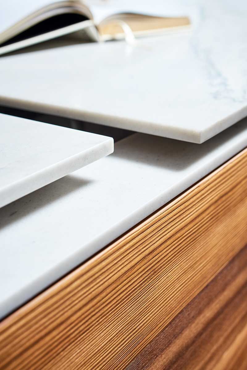 Fronts Smoked larch – Countertops Quarzite Macaubas Giotto – Tall units Kashmir satin texture lacquer and Interlink glass bronze