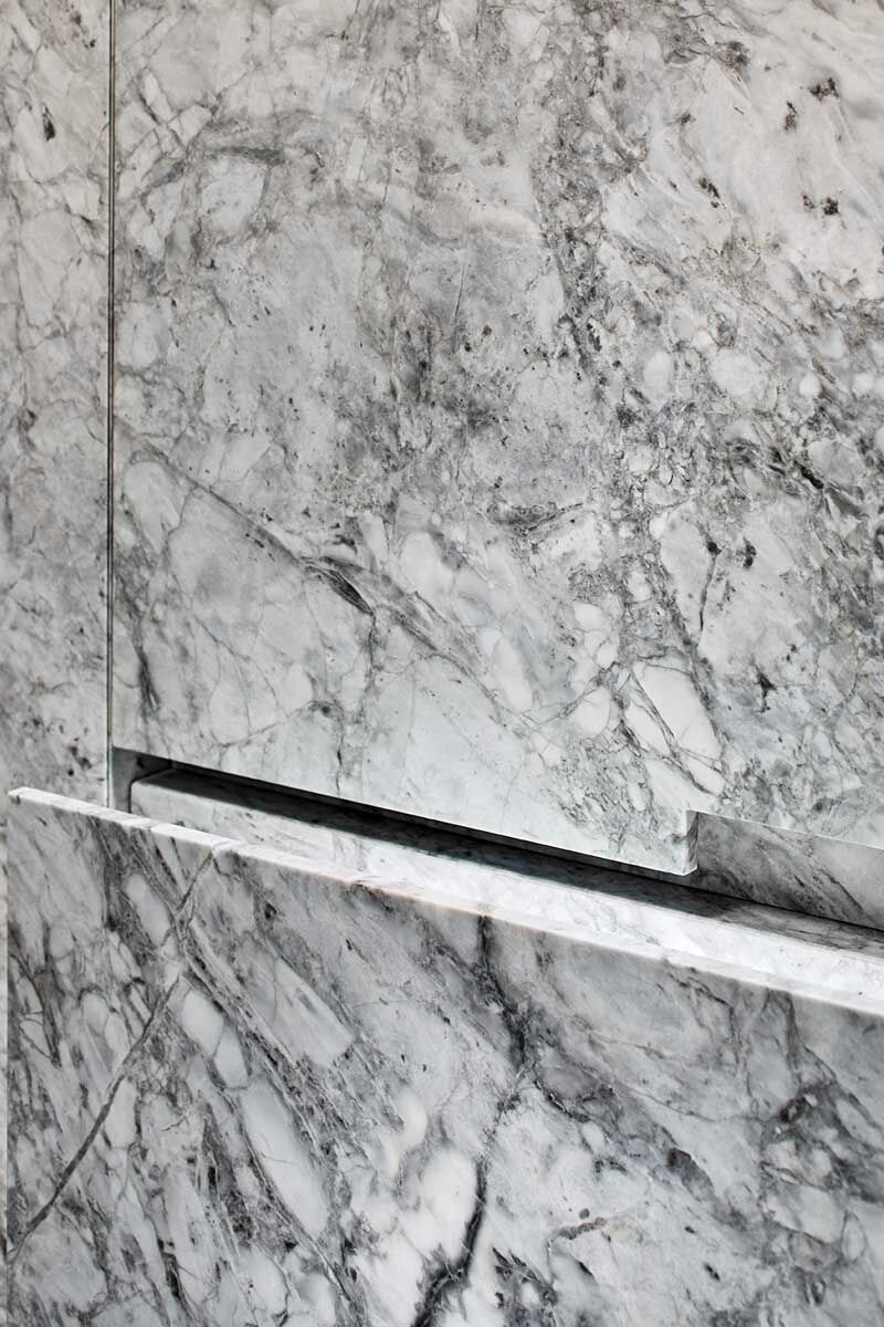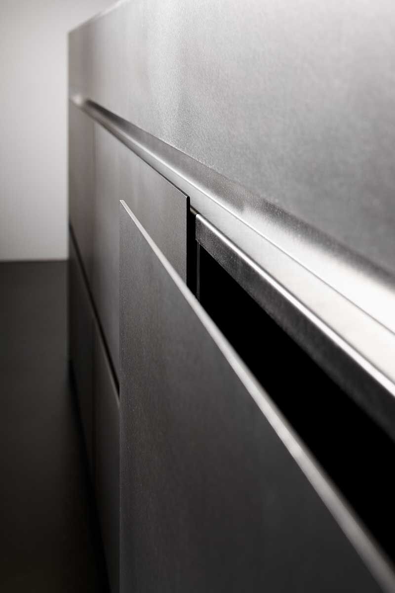 Today, eggersmann customers have dimmable LED lighting installed in almost all kitchen elements in order to give even more definition and opulence to the surface materials’ effect — here in the workbench with the quartzite Bianco Nuvola from Brazil.