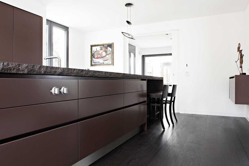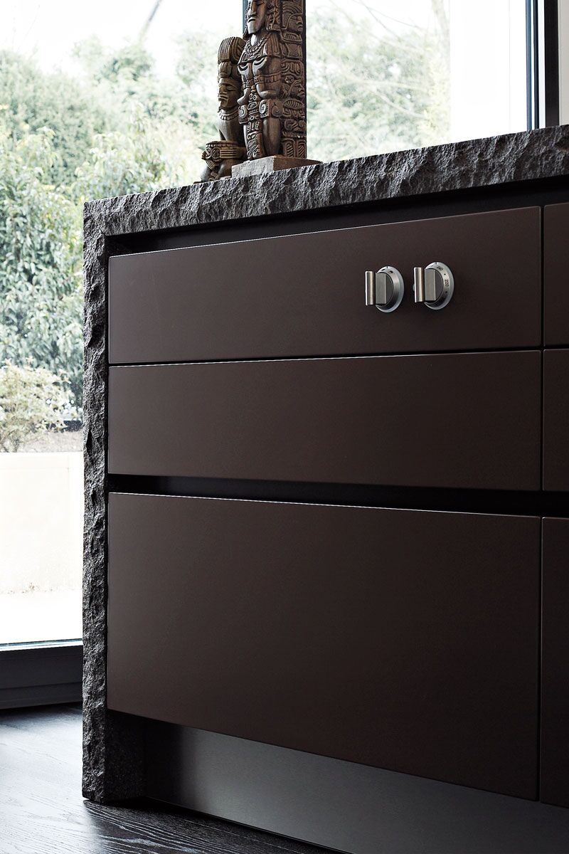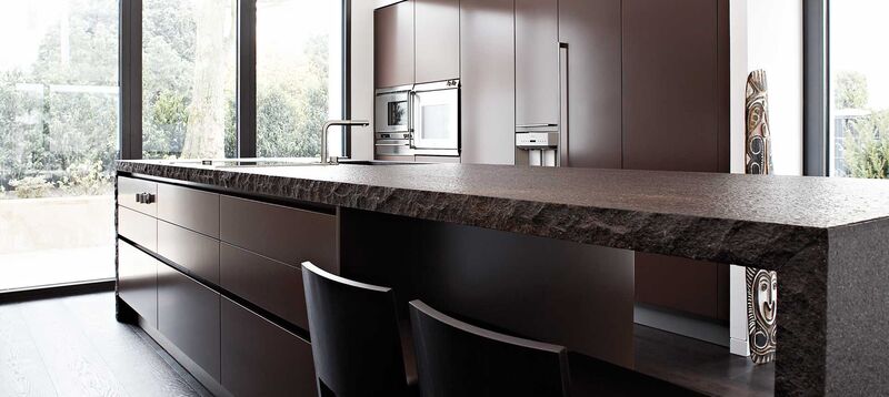 Aquí llama la atención la superficie ruda de la piedra volcánica pórfido. No hay nada embellecido o estilizado en este material, y eso es lo que lo hace tan atractivo. Entre las superficies lisas de los muebles de cocina  lacados en mate destaca especialmente la piedra natural. Esto despierta a su vez el apetito por alimentos naturales de calidad.