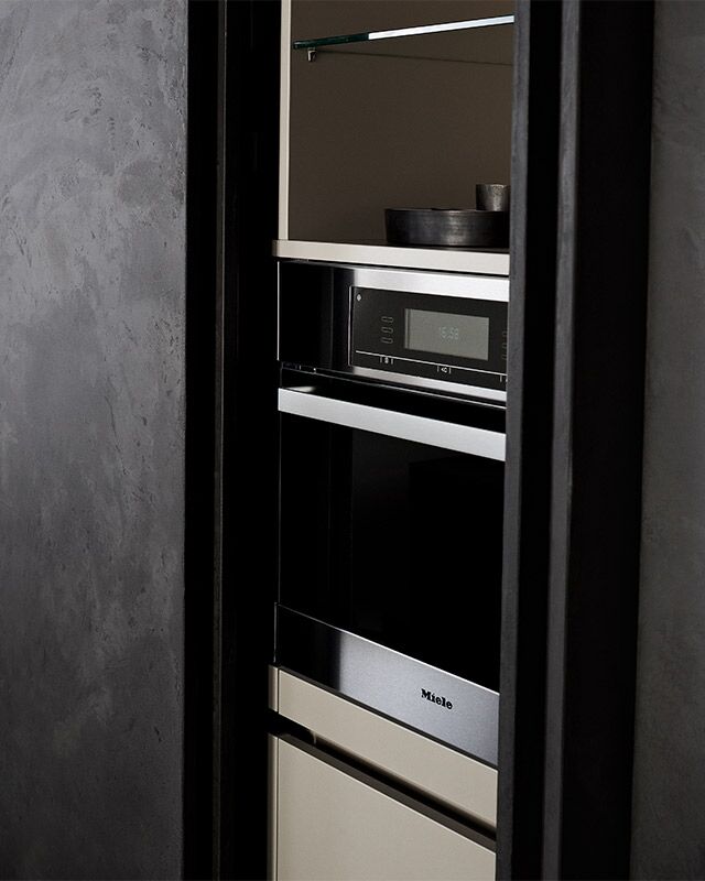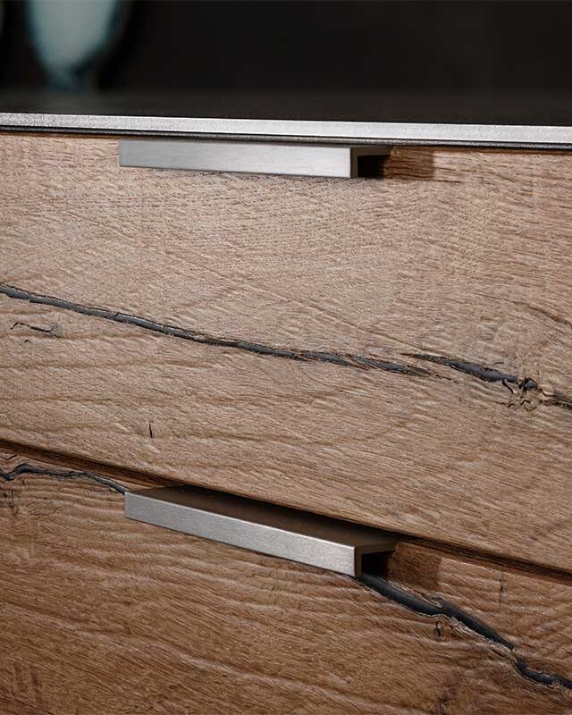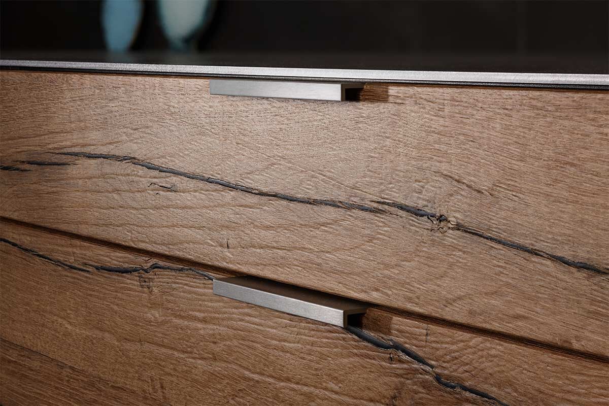 La plupart des cuisines eggersmann sont équipées d’un canal de préhension ou de la technologie Sensomatic. Ici, le cuisiniste a préféré utiliser des poignées au look ancien qui s’accordent parfaitement au bois vieilli.