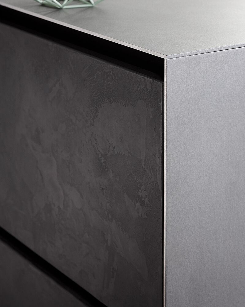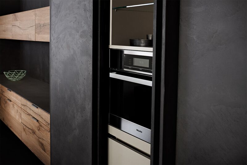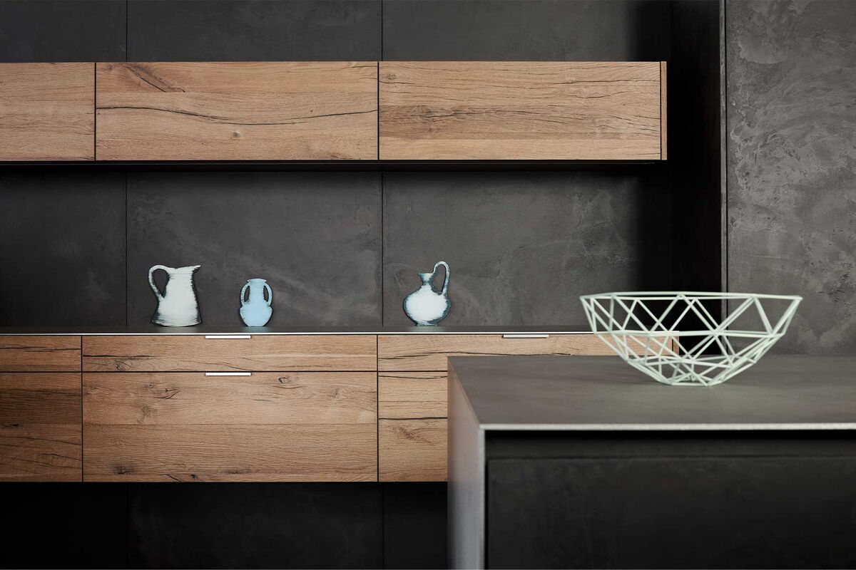 Façades en béton – plan de travail en inox silverTouch laminé à chaud – meubles en chêne vielli