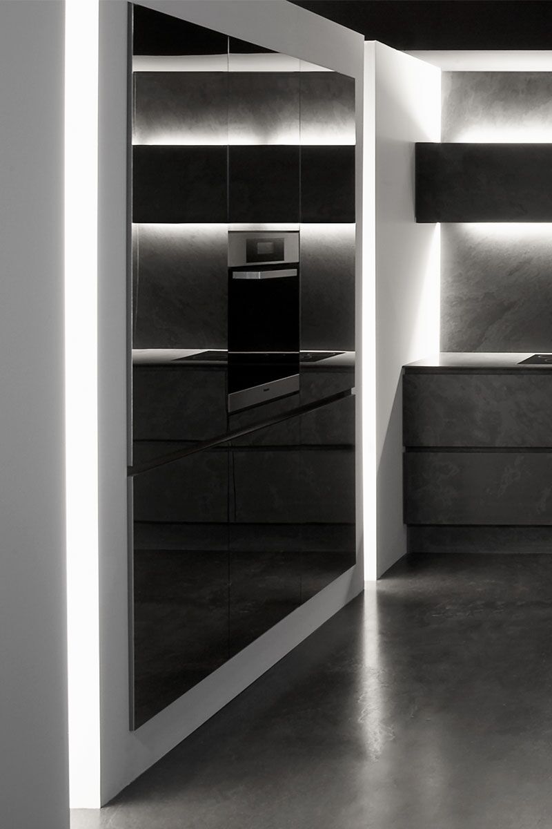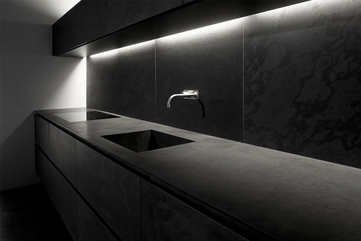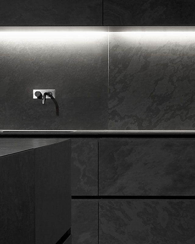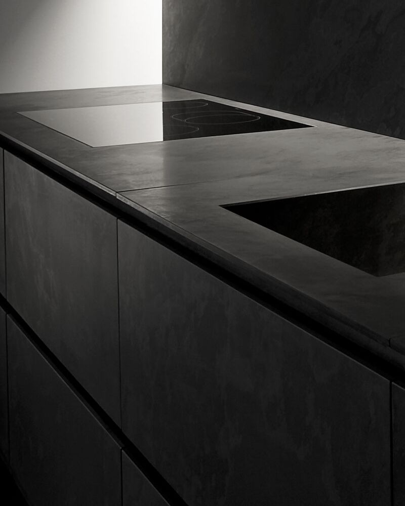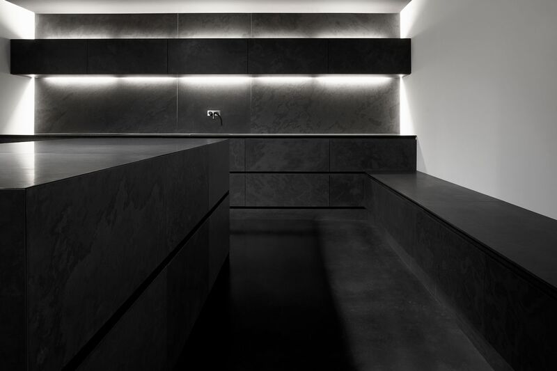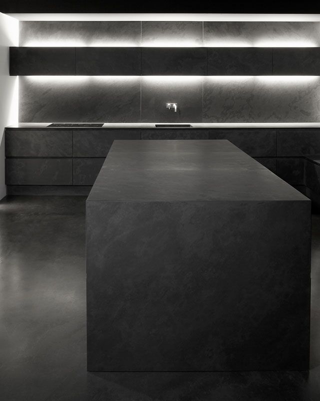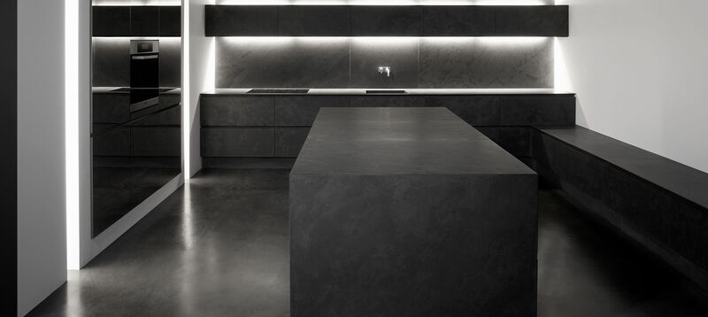Presque paradoxale : cette cuisine sombre arbore un éclat tout particulier. De l’îlot aux panneaux arrière en passant par le sol, tout est réalisé dans la même ardoise noire.