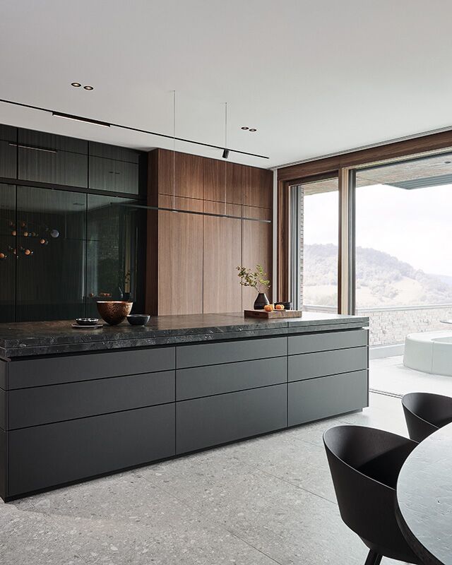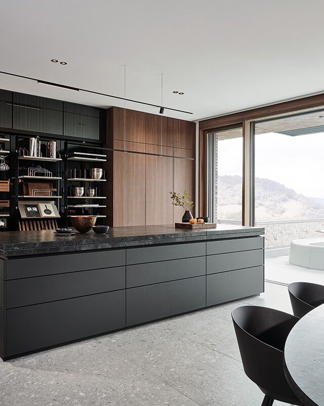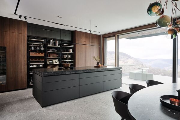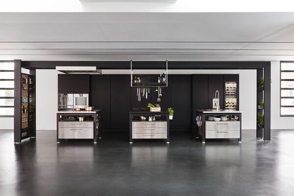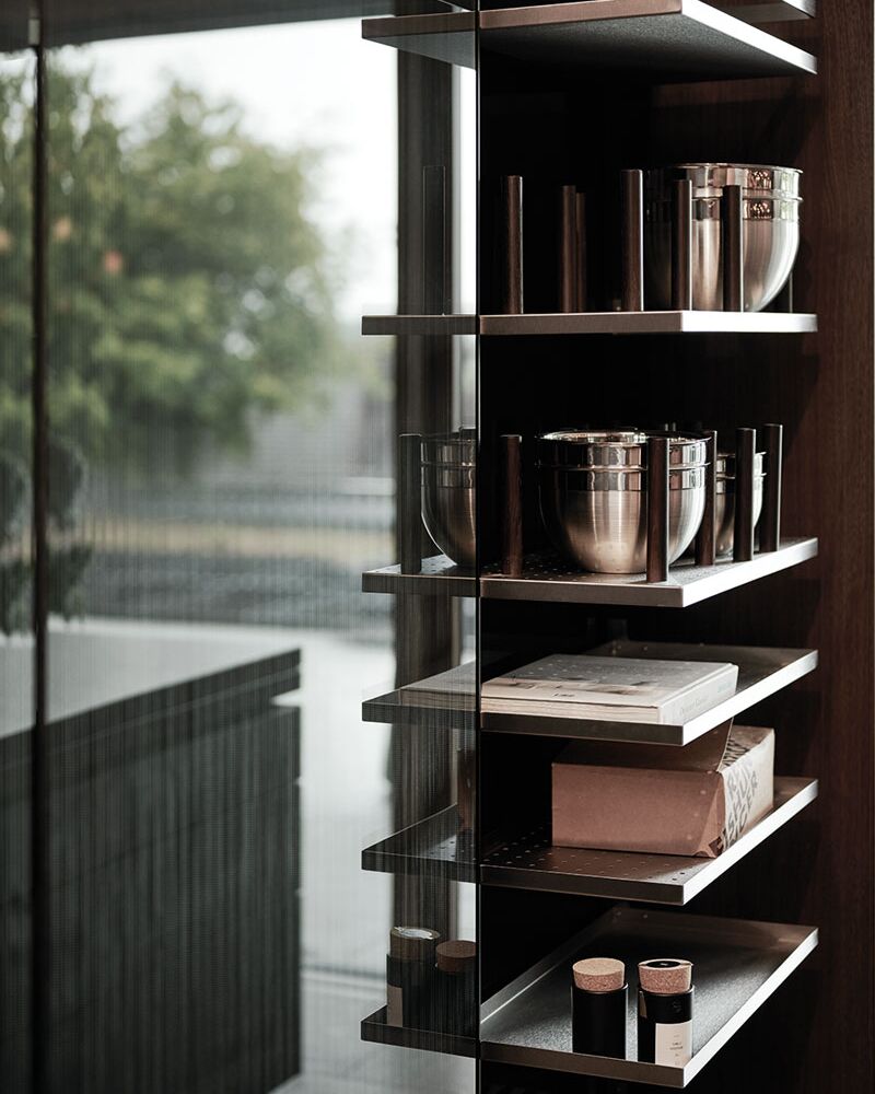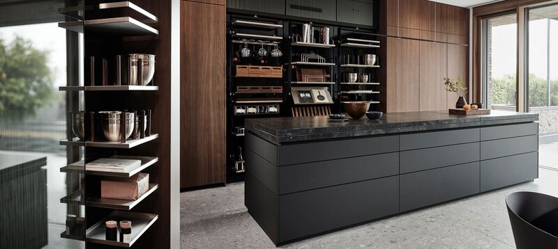 Draai-elementen bieden onbeperkte opbergmogelijkheden achter elegante glazen fronten. Hier schept eggersmann met zijn innovatieve functionaliteit ruimte voor de individuele opstelling van keukengerei en accessoires.