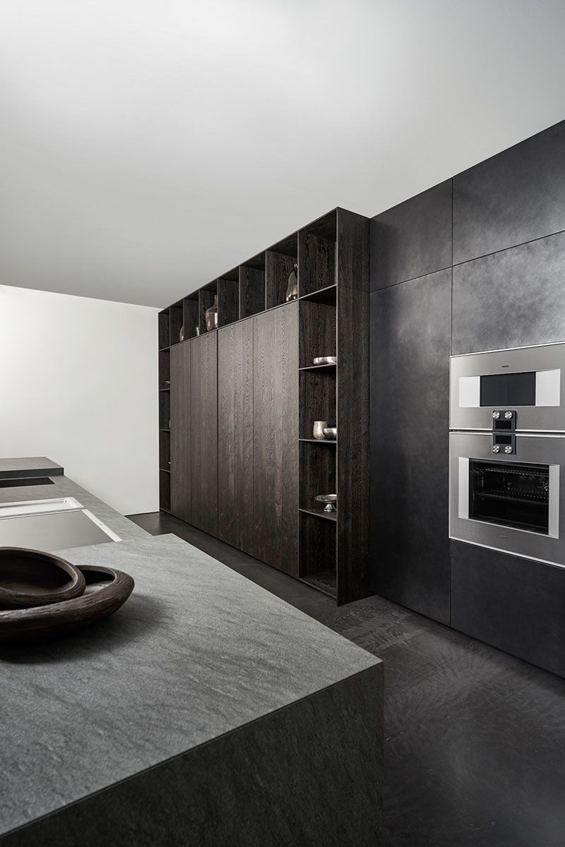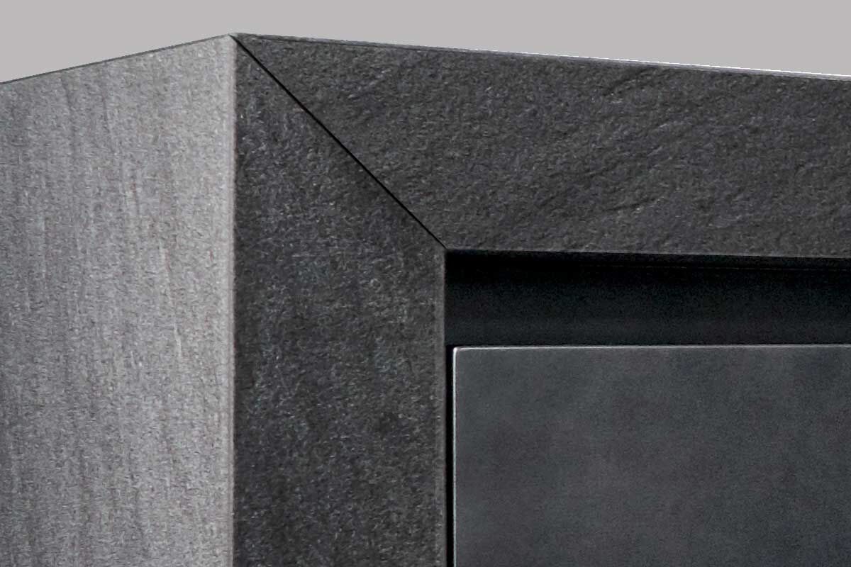 Quarzit Carbono – Effektlack stahlgrau – Eiche Furnier schwarzbraun