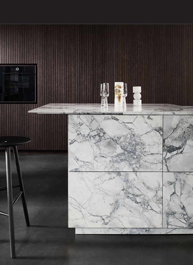 EBX bietet eine puristische Optik mit 13 mm starken Zargen und benötigt keine Abdeckkappen oder Bohrungen für die vierdimensionalen Verstellmöglichkeiten der Fronten.