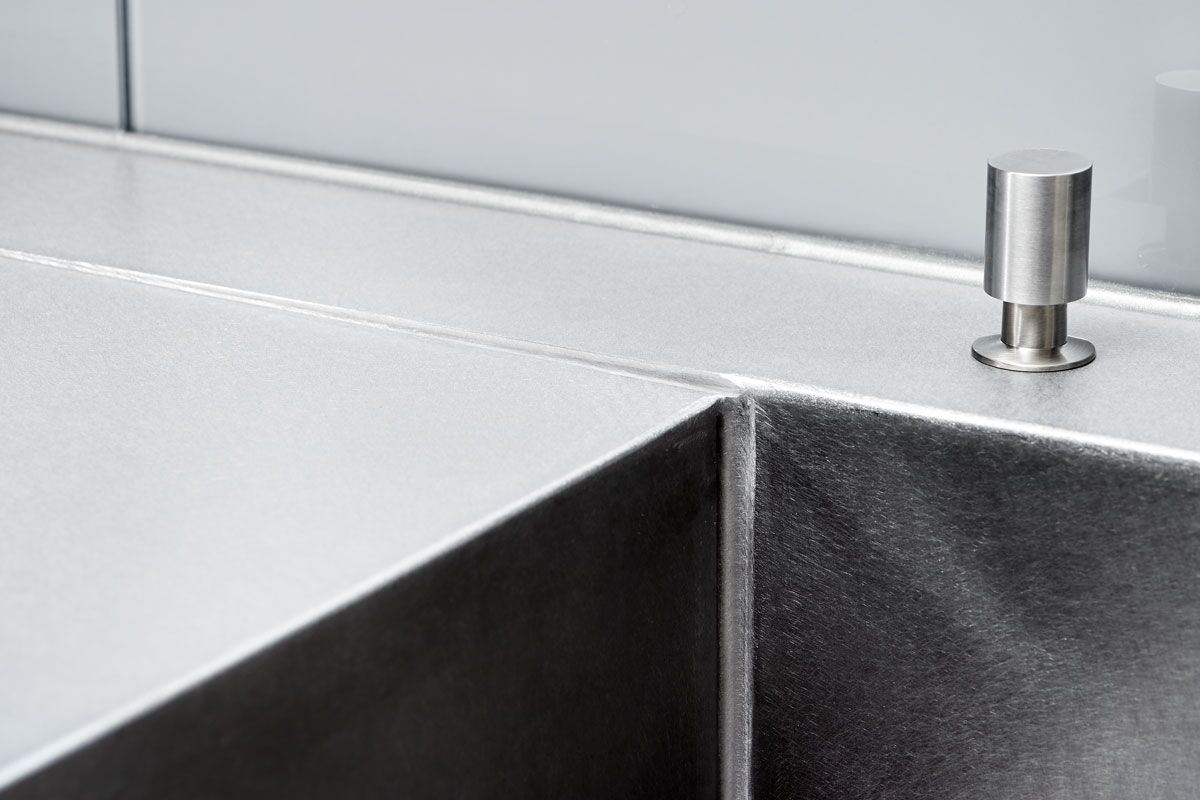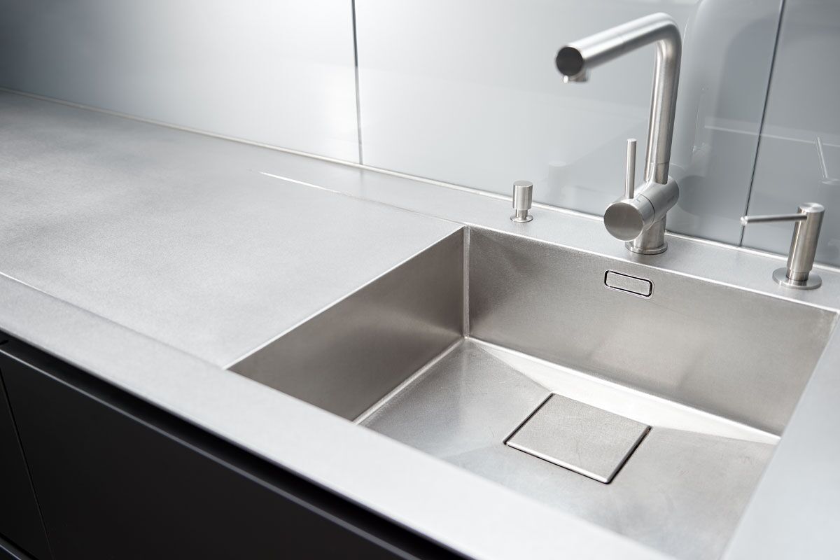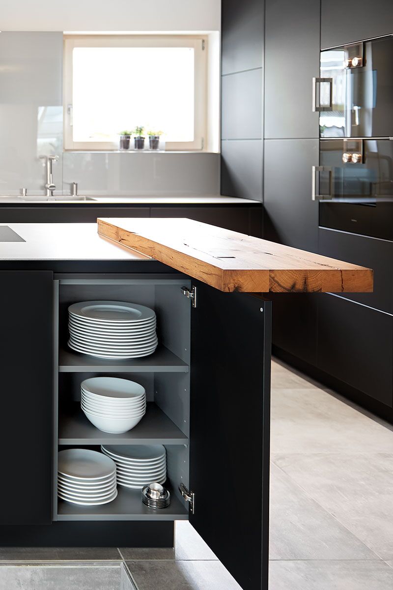 Katalogbilder vermitteln manchmal den Eindruck, als könne man hochqualitative Designerküchen nur auf sehr großen Grundrissen realisieren. Diese elegante Küche mit Oberflächen aus Laminat Nano schwarz und einer Arbeitsplatte aus Edelstahl silver Touch beweist auf eindrückliche Art das Gegenteil.