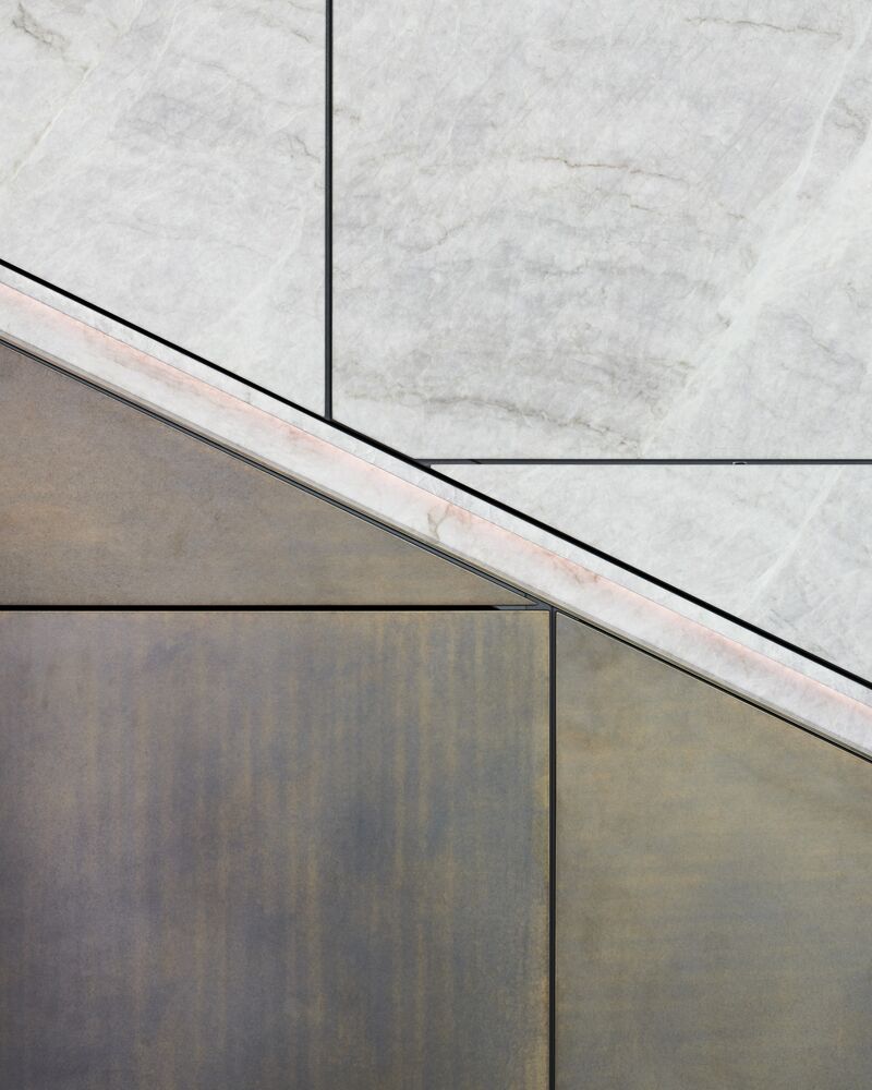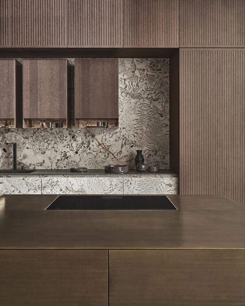 Das SKYWALK®-Design definiert die monolithische Essenz der Küchenarchitektur neu und verbindet den faszinierenden transluzenten Granit White Tiger mit markantem bronziertem Messing in einer diagonalen Verschiebung - eine faszinierende Symbiose.