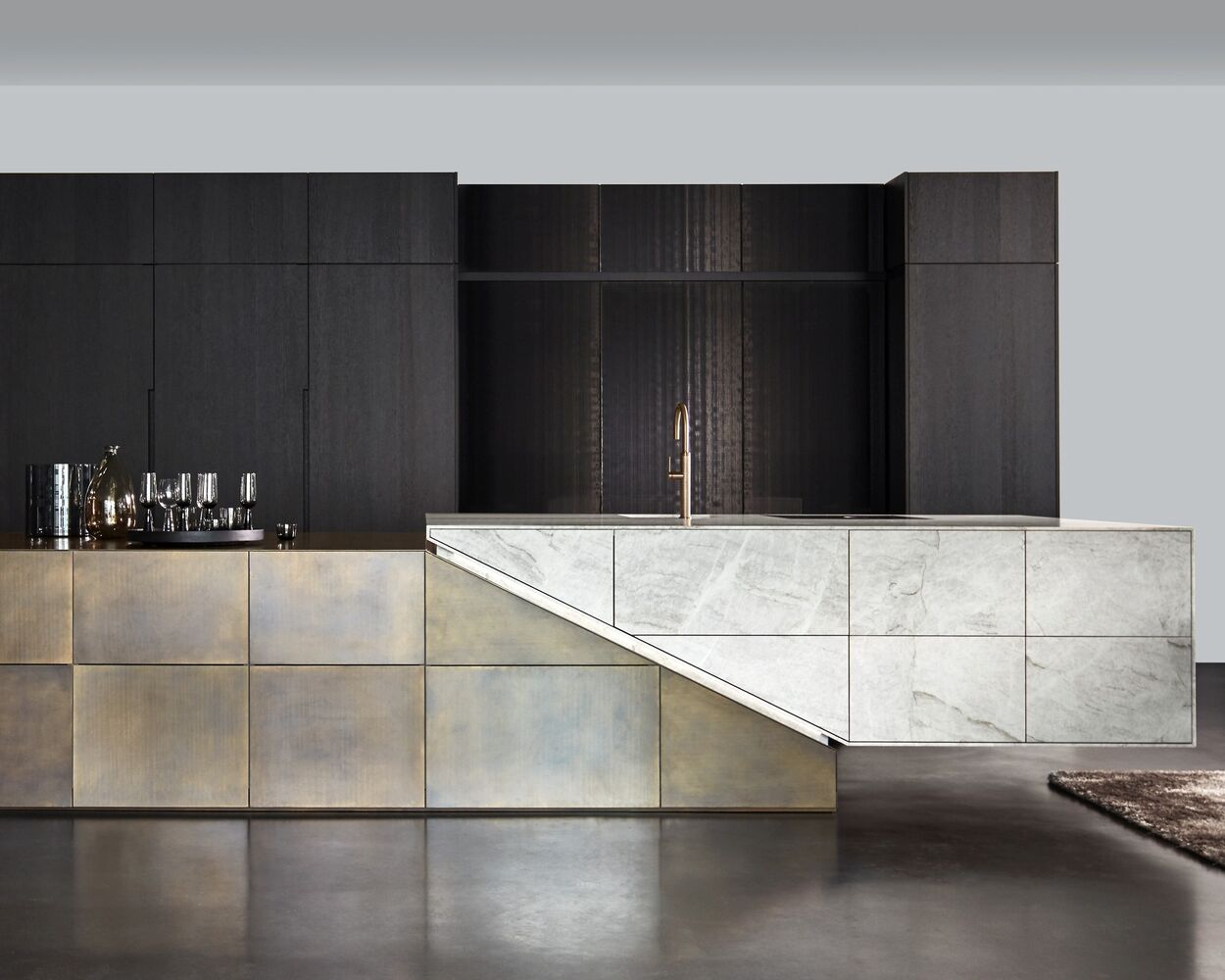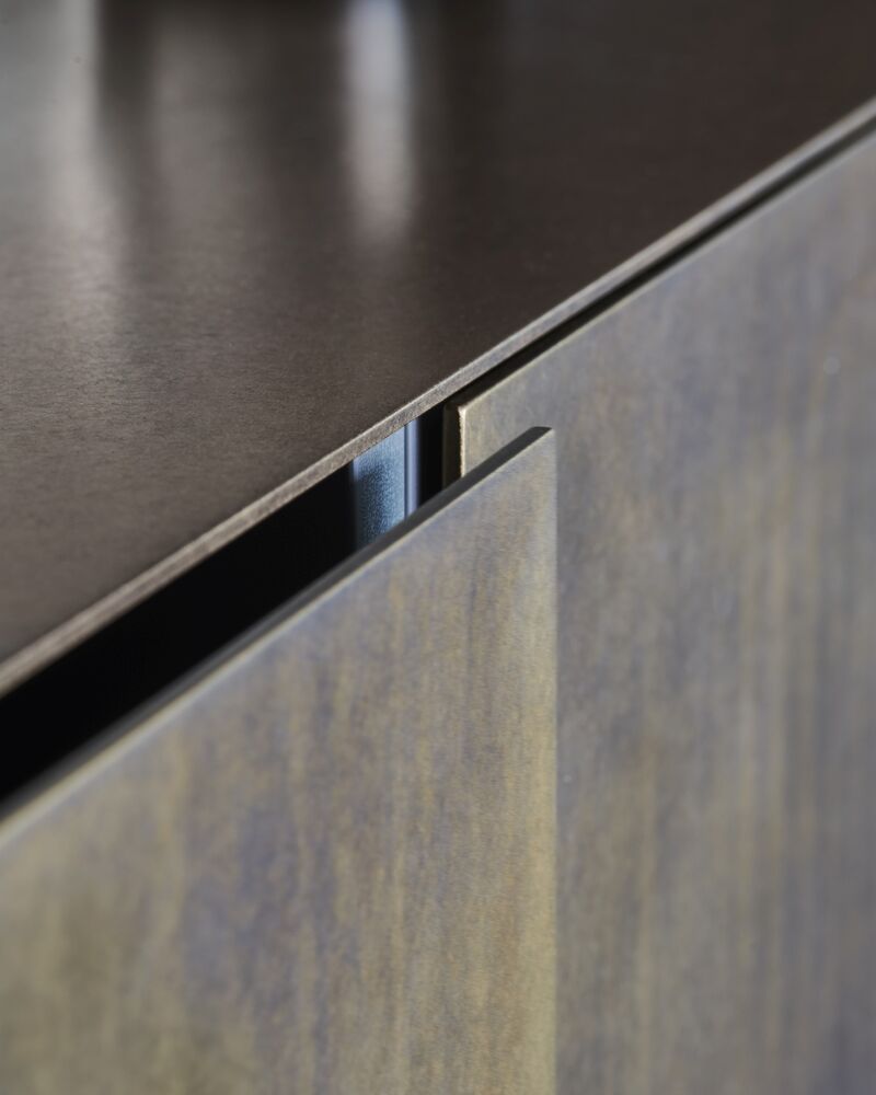 Der tiefgoldene Messington erhält durch Brünieren besondere Schattierungen und individuelle Farbverläufe, die den authentischen, handwerklichen Charakter des Materials unterstreichen und die Kücheninsel zu einem einzigartigen Meisterwerk machen.