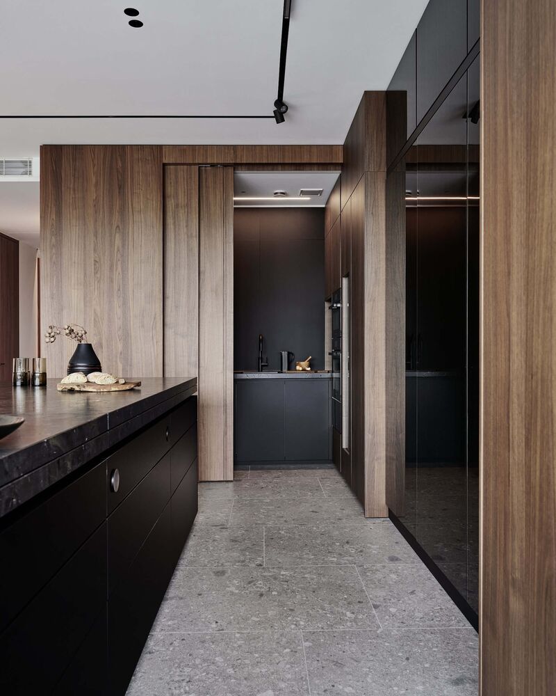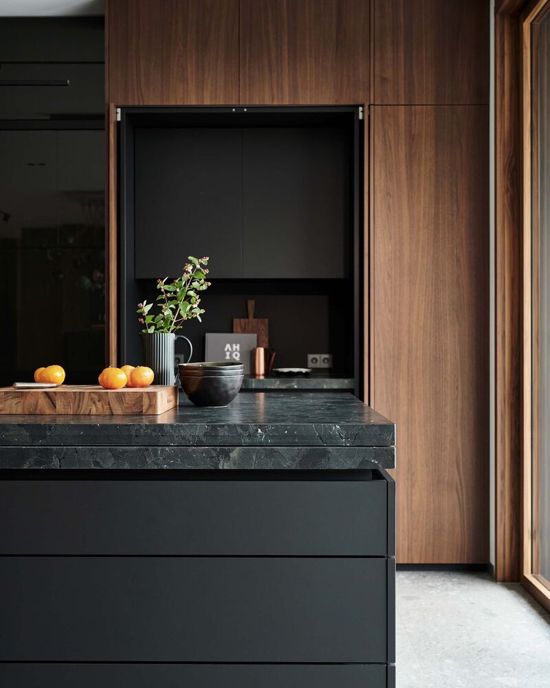 die aus dem eleganten Furnier der Küchenfronten gefertigt sind.