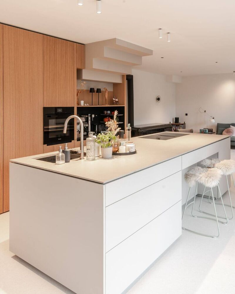 The spacious kitchen island, bright and monochrome in Kashmir, has a light and inviting feel.