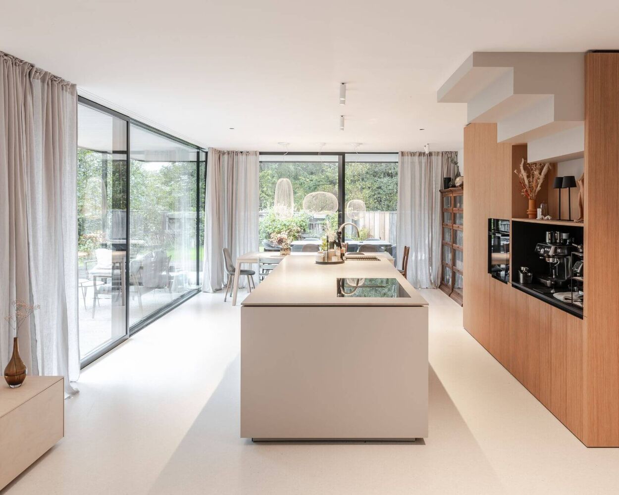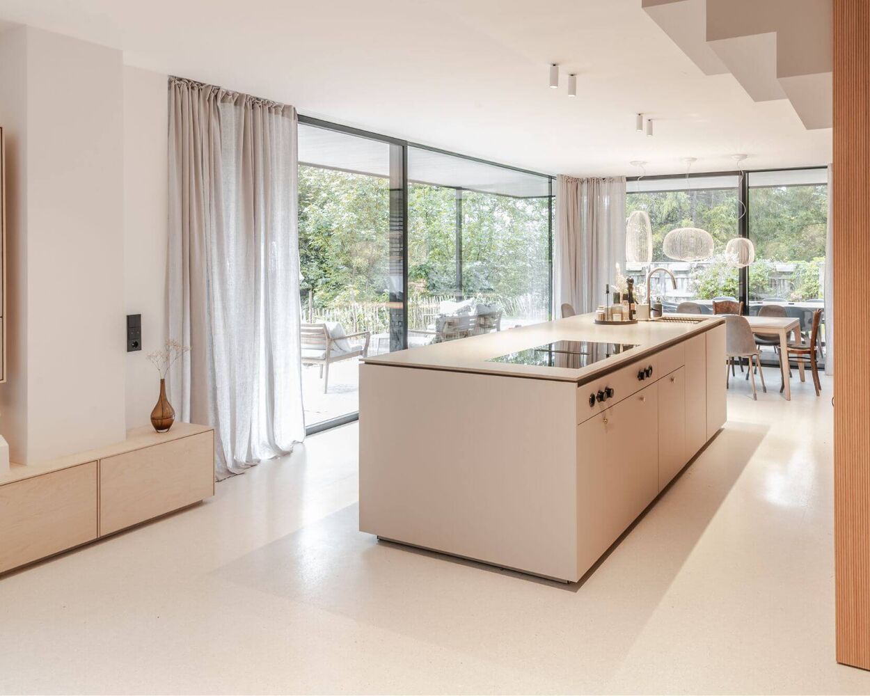 A light-filled space that blends living, cooking, and dining into one. Floor-to-ceiling windows open up to green views, while terraces on two sides extend the interior and allow nature and the kitchen to flow into one another.