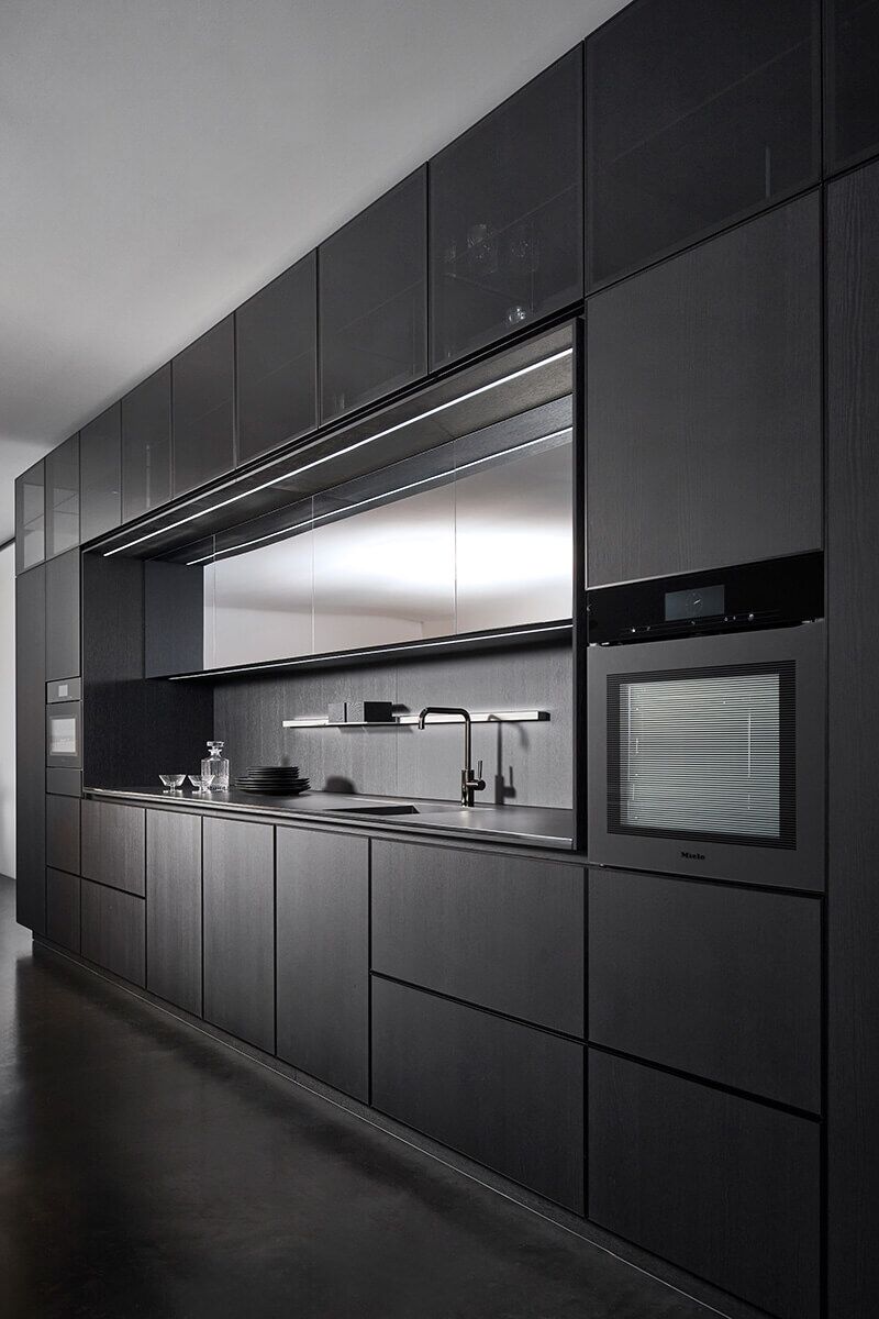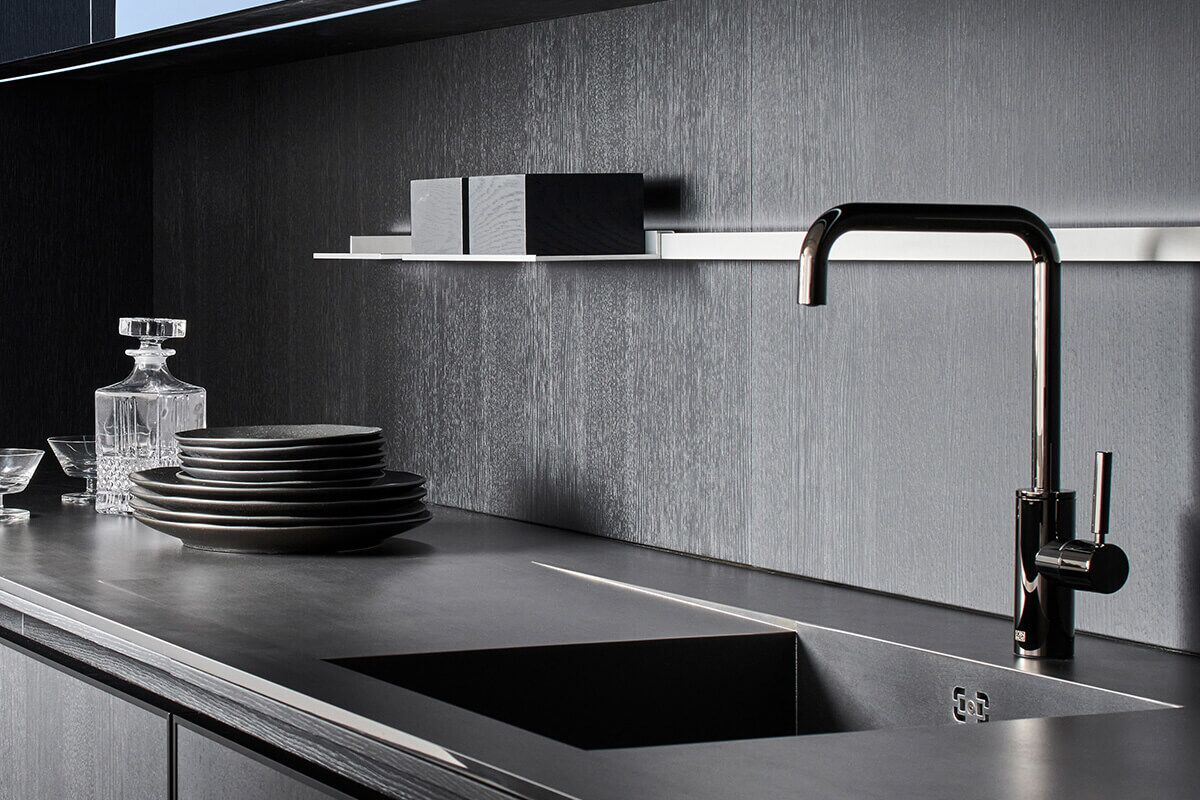 The concept of this minimalist kitchen is based on the monochrome choice of materials and perfectly crafted details – variations of stainless steel surfaces are showcased here with elegant oak veneer in basalt black and matching black glance glass cabinets. The sink area is characterised by stainless steel black-touch with a continuous worktop. The innovative surface has a warm feel and is robust, hard-wearing and easy to clean.
