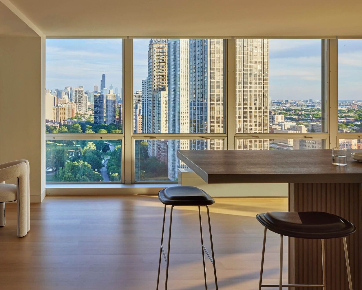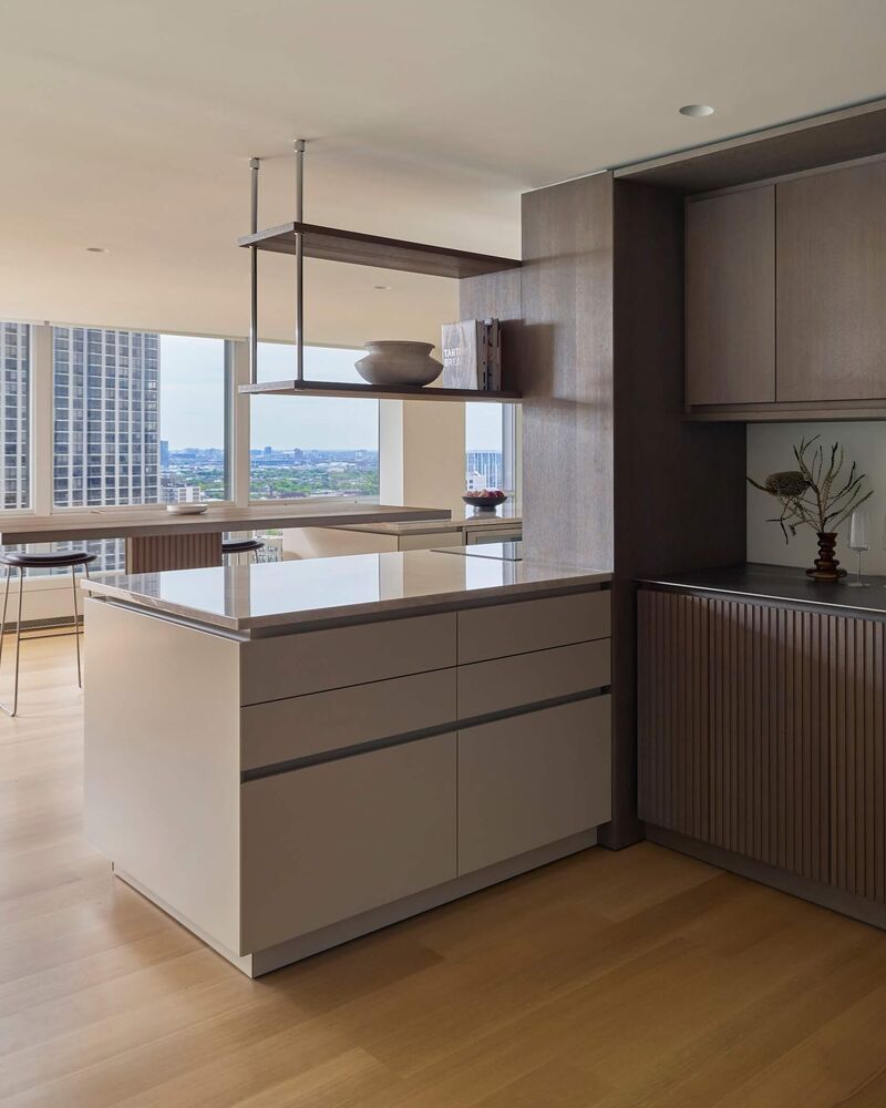 The Promenade Apartment is located in Mies van der Rohe's Commonwealth Plaza Chicago, a listed high-rise residential building from 1957, whose sensitive renovation is based on the architect's vision of integrating the kitchen into the core of the building.