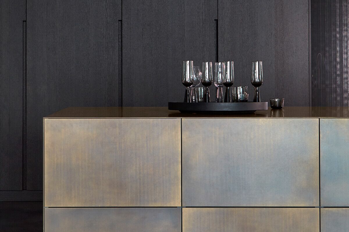 The SKYWALK® design breaks up the monolithic character of the burnished brass and Taj Mahal leather quartzite kitchen island, making the island elements appear to be floating in the air despite being made of solid natural stone.