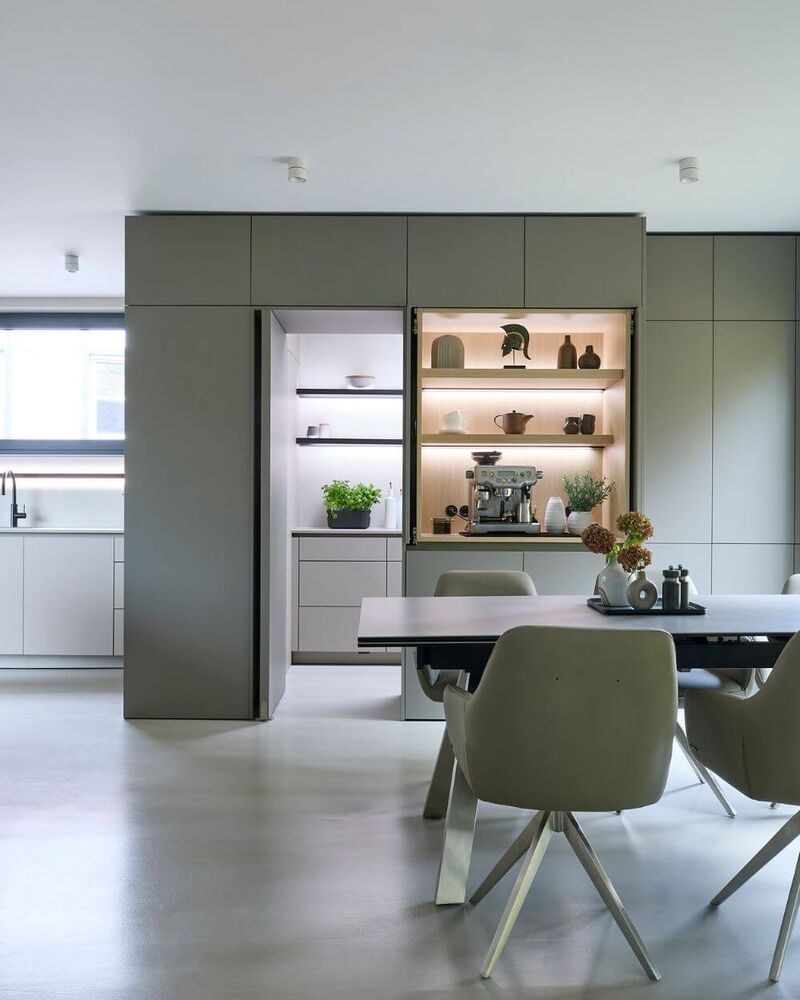 Une porte battante encastrée mène à l'arrière, où se trouvent le garde-manger et l'espace fonctionnel.