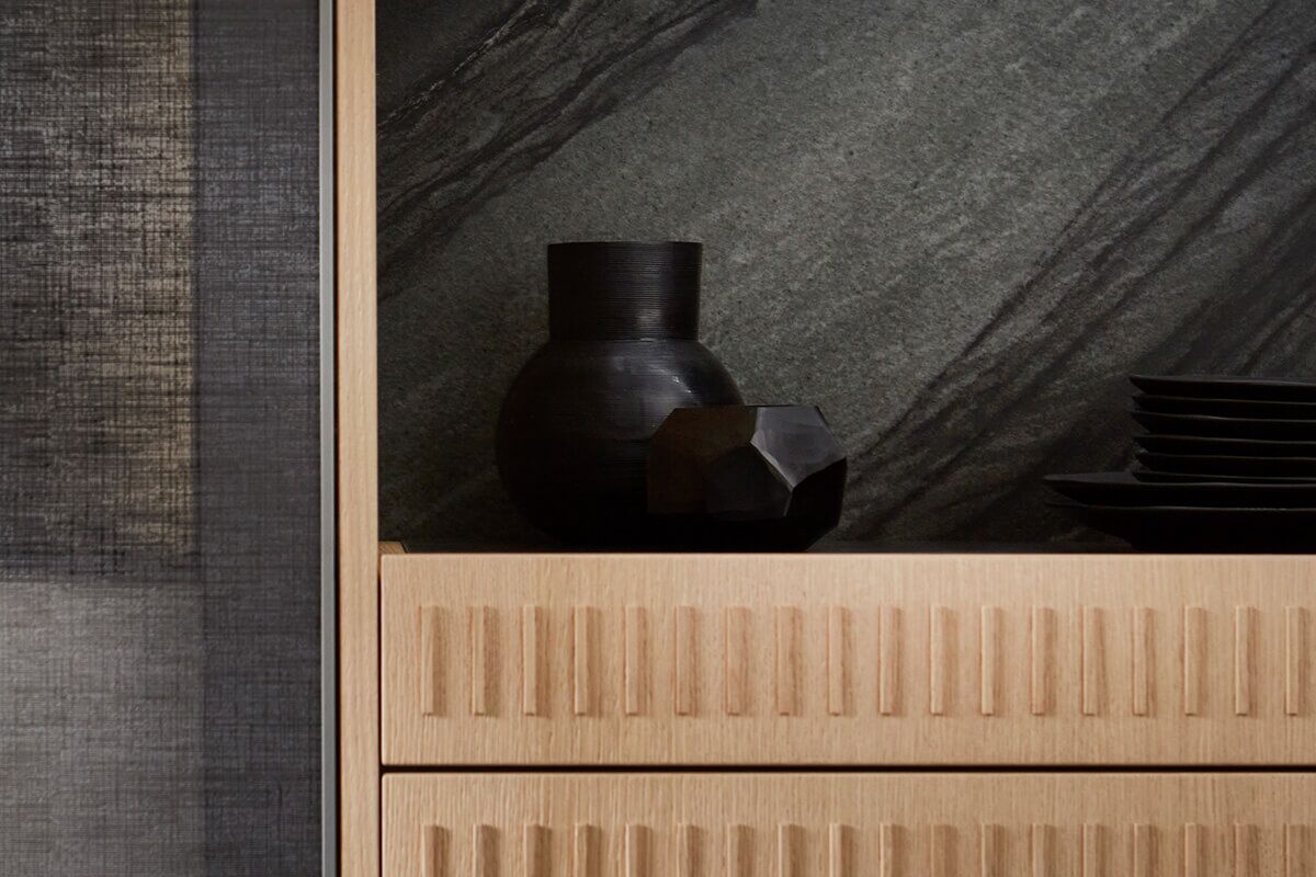 Par la fluidité de son veinage et sa texture chatoyante, le quartzite Black Tempest crée un contraste dynamique avec OSAKA ; l’élégant placage chêne accentue la verticalité avec de fins bandeaux posés avec précision sur la façade, conférant à l’ensemble un design minimaliste.