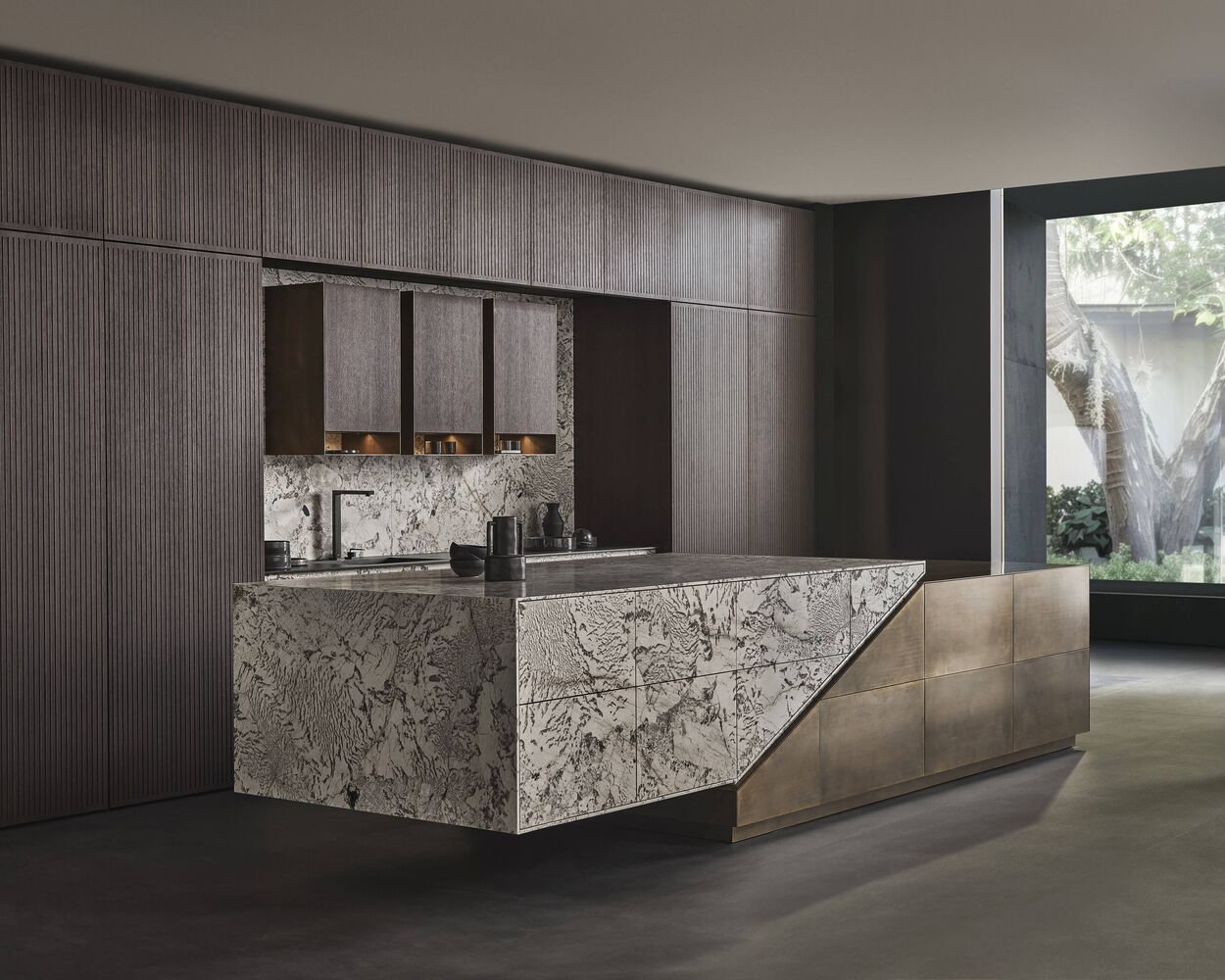 La teinte dorée profonde du laiton se voit attribuer des effets nuageux particuliers par le bronzage, soulignant le caractère authentique et artisanal du matériau et transformant l'îlot de cuisine en un chef-d'œuvre unique.