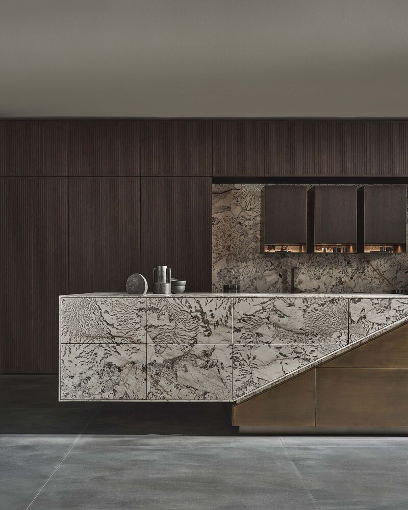 Les éléments de l'îlot en pierre naturelle massive et en métal véritable semblent flotter - un élément structurel central garantit la stabilité et accueille les installations essentielles.